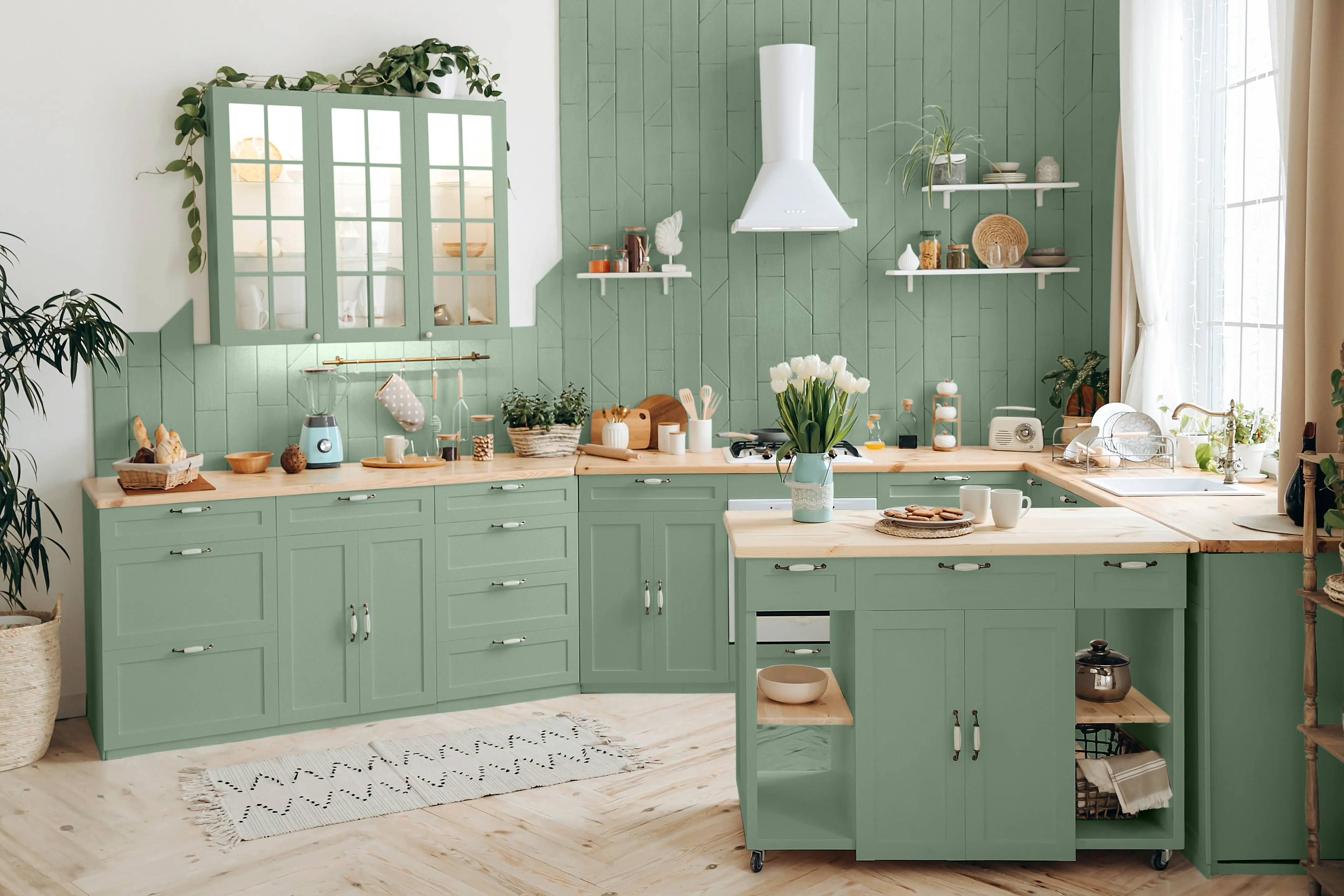 Das beste Ergebnis erhältst du, wenn du den grünen Lack in zwei dünnen Schichten aufträgst. Eine Lackrolle mit Schaumstoffaufsatz oder ein weicher Pinsel sind ideal dafür, aber auch ein Auftrag mit einem Spritzgerät ist möglich.