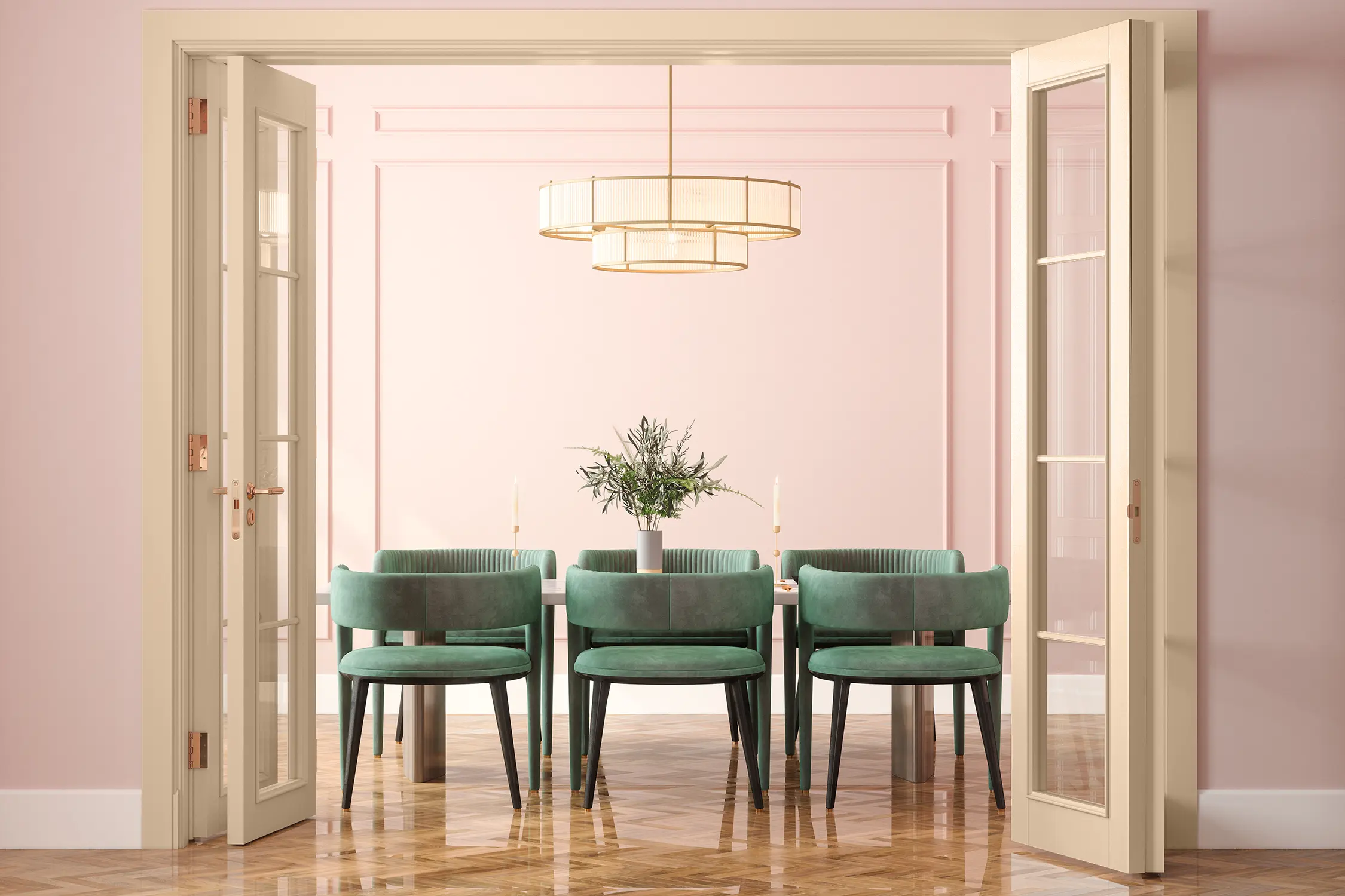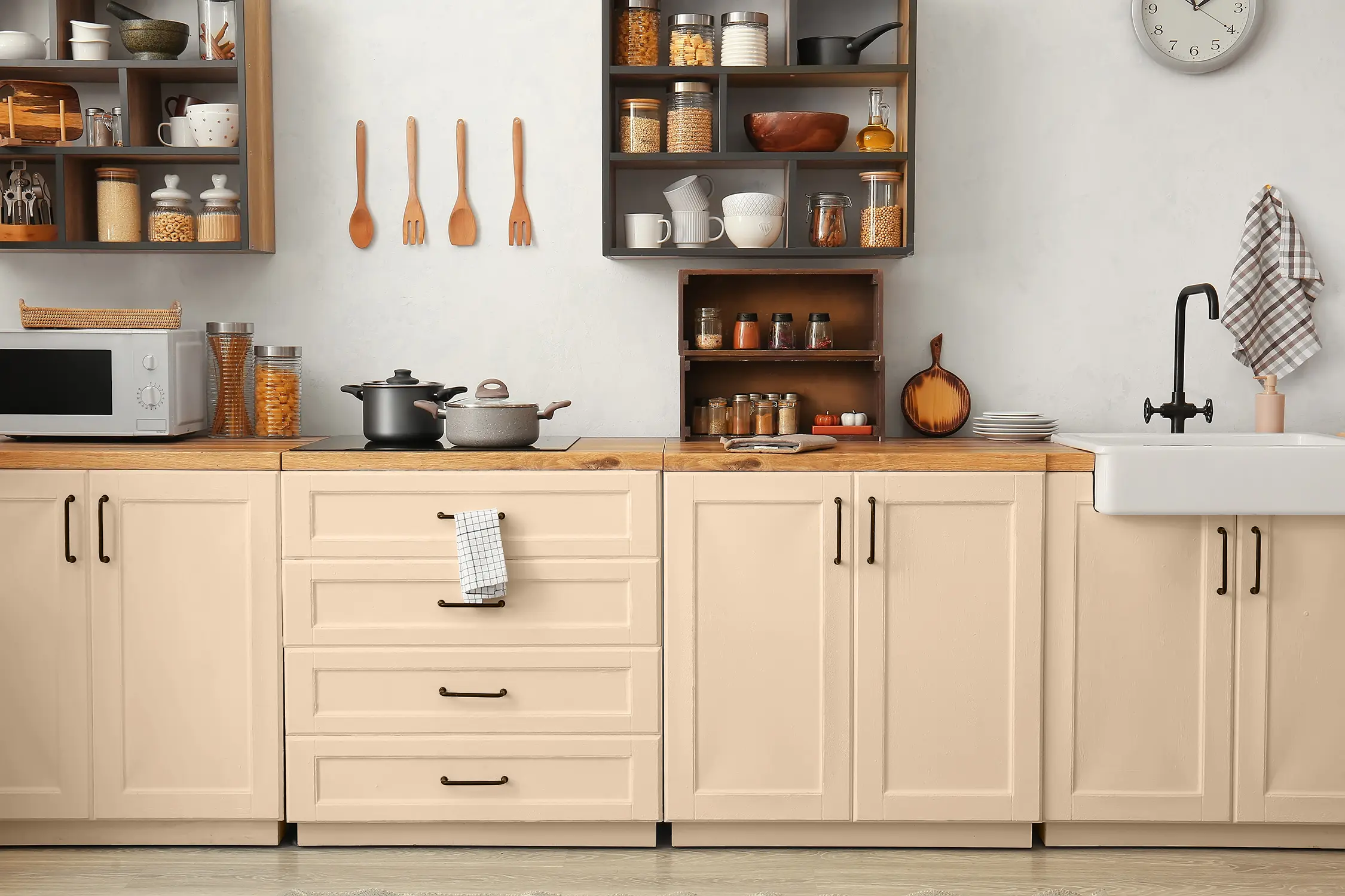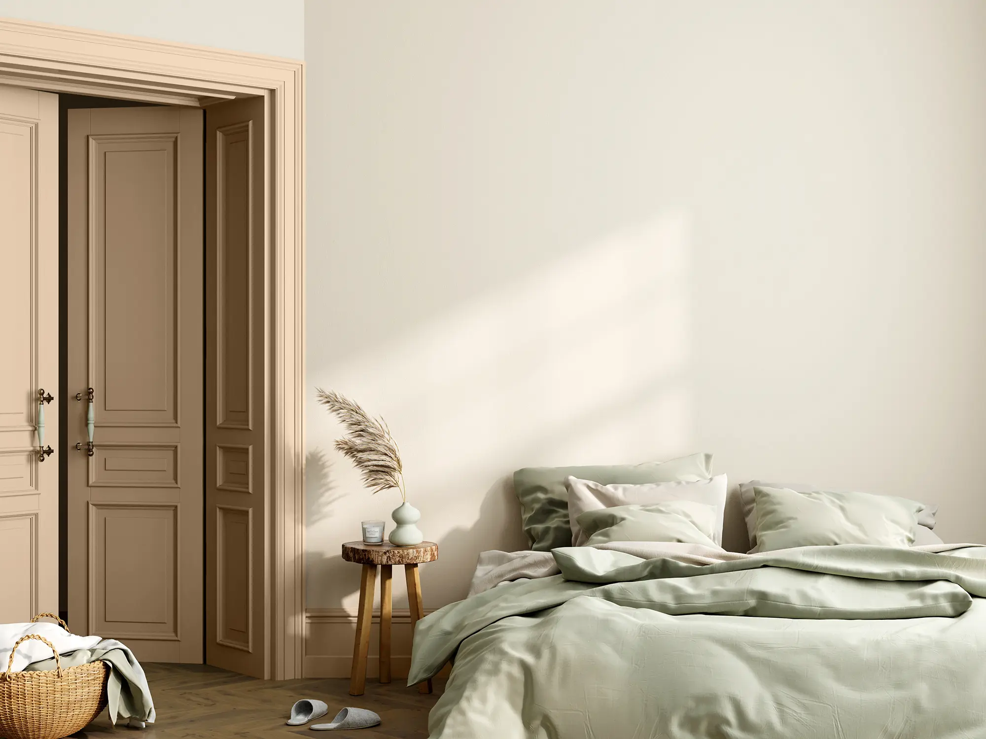 Warme Beige- und Apricottöne harmonieren wunderbar mit Holztönen – ob hell oder dunkel. Streiche zum Beispiel die Stuhlbeine eines alten Holzstuhls bis zu einer bestimmten Höhe oder die Schubladen einer Holzkommode, um das Möbelstück zu einem freundlich strahlenden Blickfang im Raum zu machen.