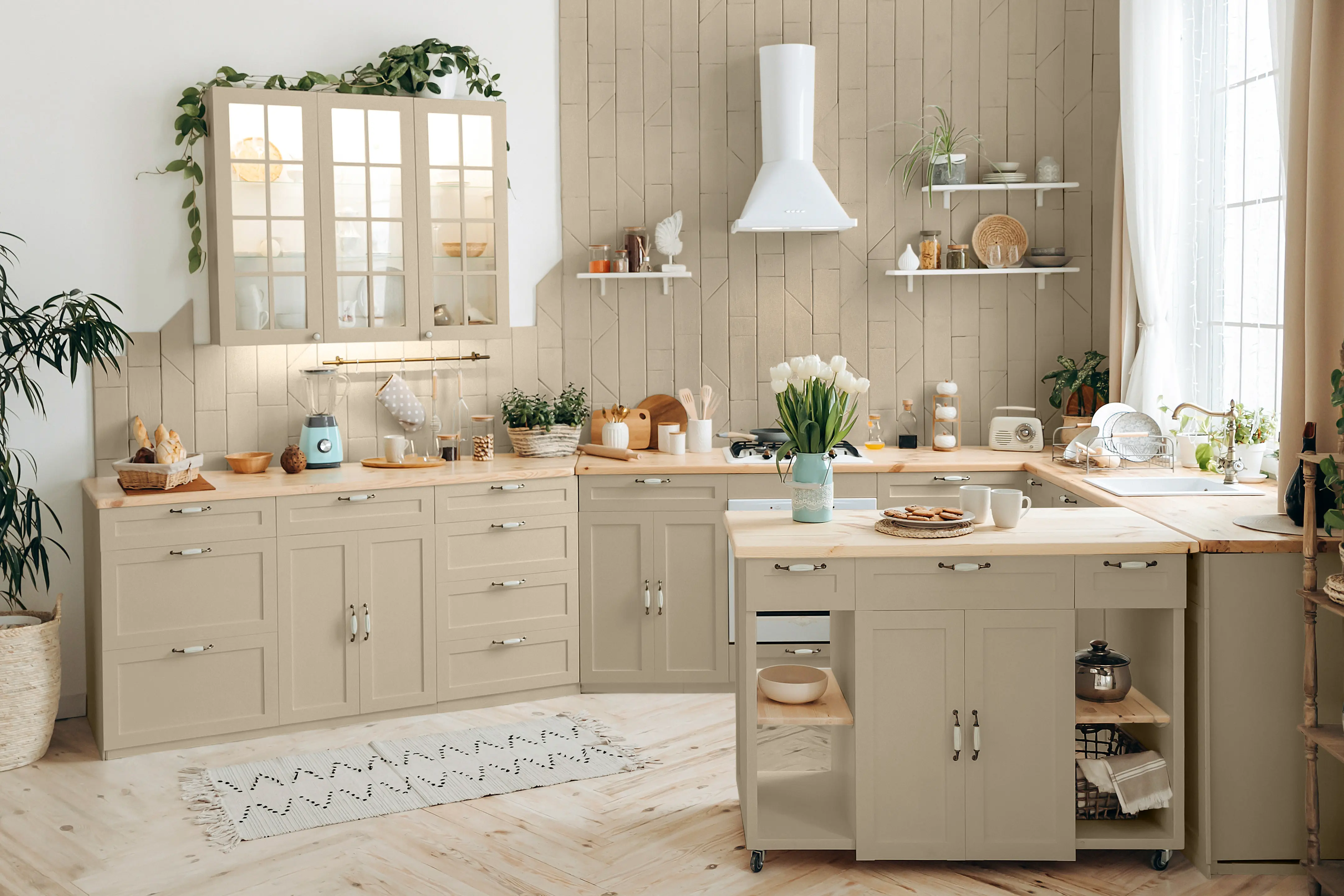 Das beste Ergebnis erhältst du, wenn du den graubeigen Lack in zwei dünnen Schichten aufträgst. Eine Lackrolle mit Schaumstoffaufsatz oder ein weicher Pinsel sind ideal dafür, aber auch ein Auftrag mit einem Spritzgerät ist möglich.