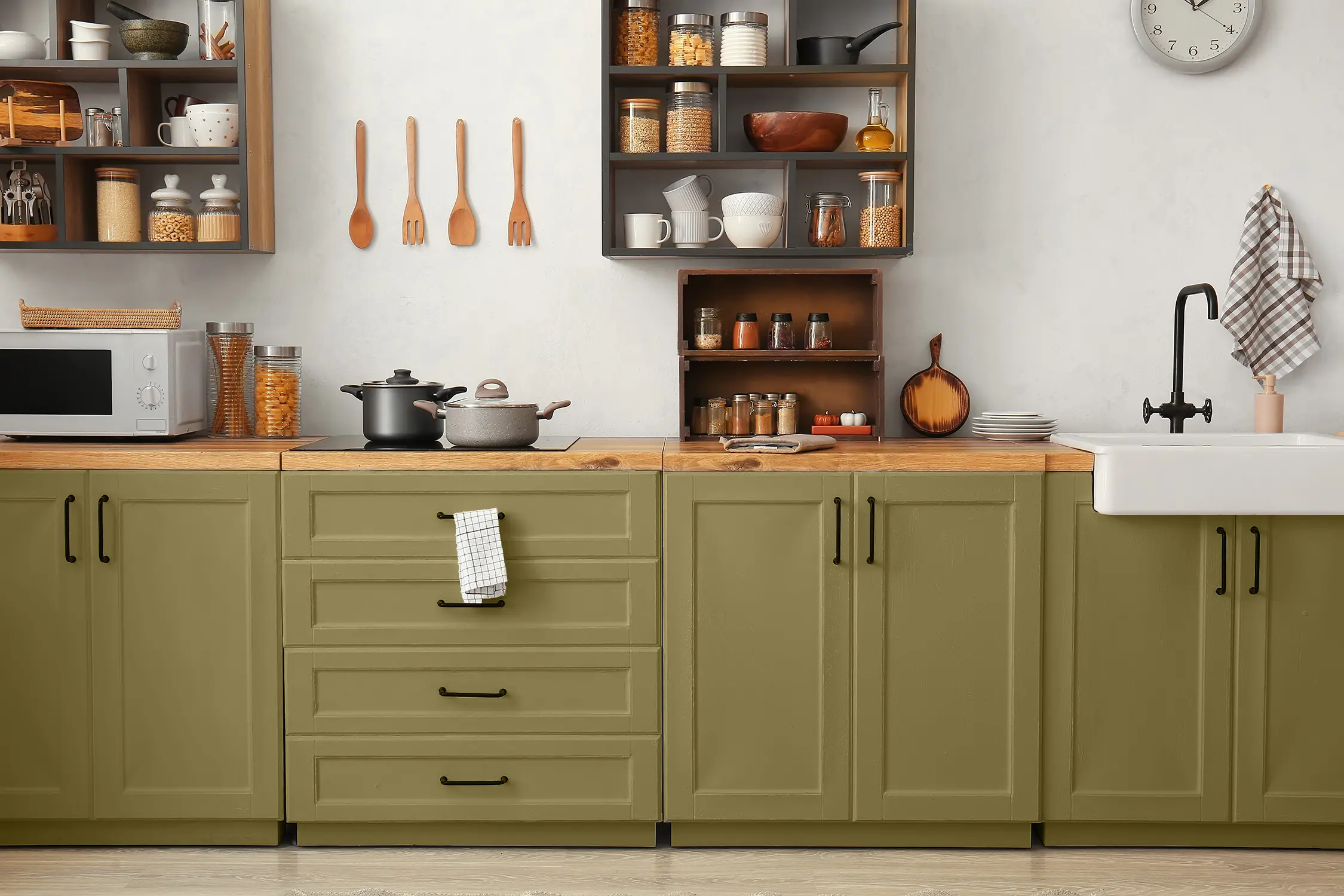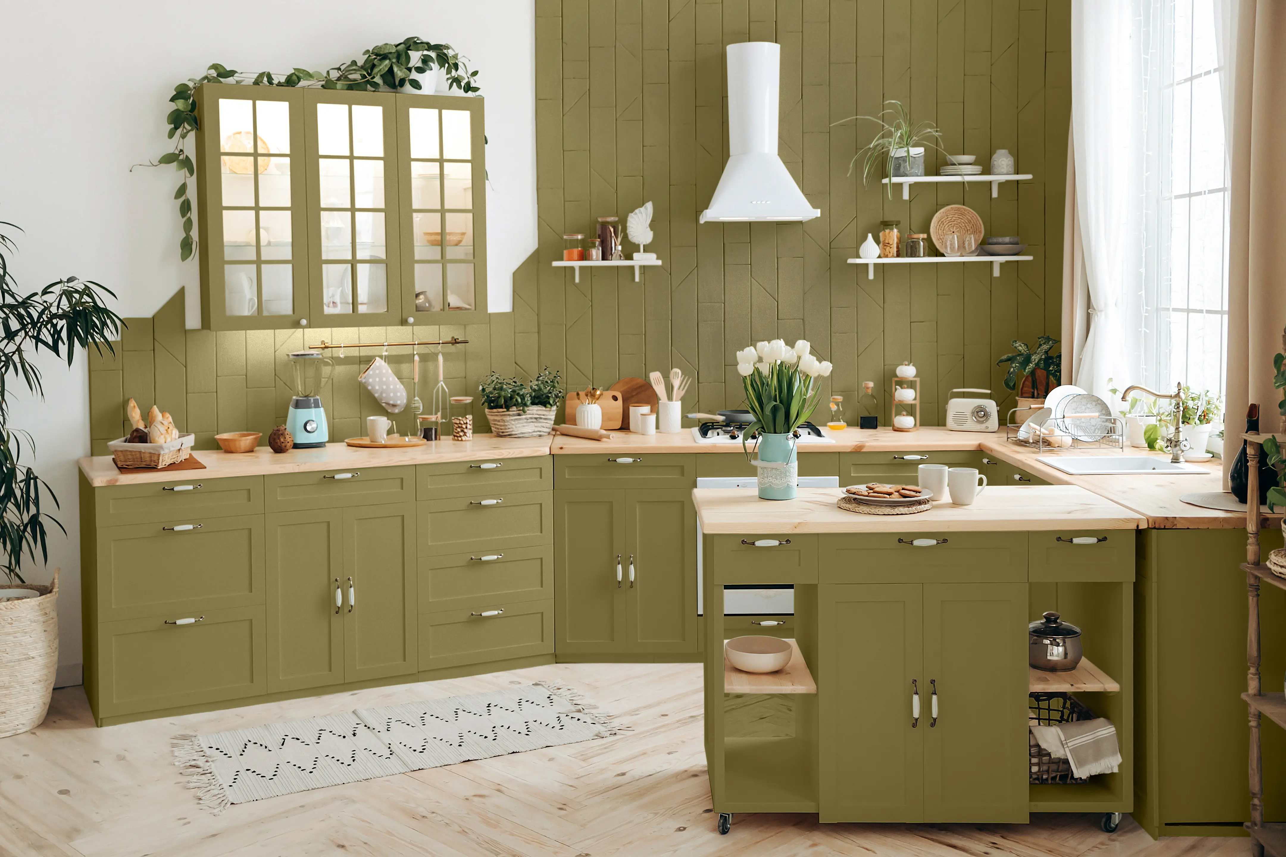 Das beste Ergebnis erhältst du, wenn du den olivgrünen Lack in zwei dünnen Schichten aufträgst. Eine Lackrolle mit Schaumstoffaufsatz oder ein weicher Pinsel sind ideal dafür, aber auch ein Auftrag mit einem Spritzgerät ist möglich.