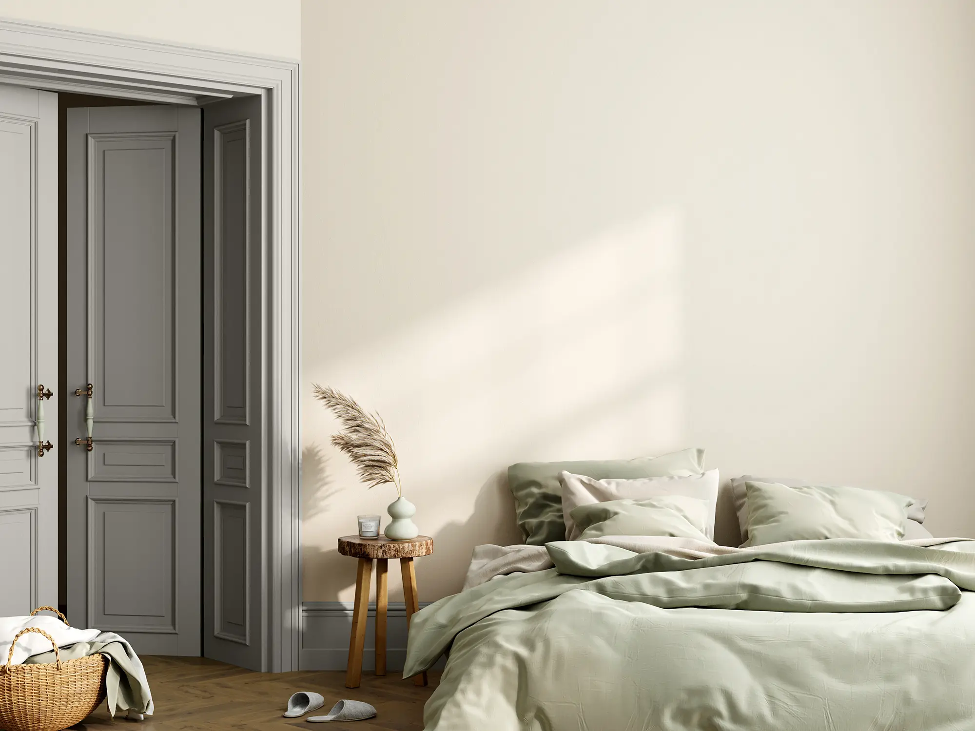 Caleo-Tipp: Helle und neutrale Farbtöne wie „Raureif“ sind die perfekte Grundlage, um Muster und bunte Akzente optimal zur Geltung zu bringen. Streiche die helle Farbe daher zum Beispiel auf großen Flächen wie Schranktüren oder Korpus und nutze kräftigere Farbtöne, um kreative Verzierungen darauf zu setzen.