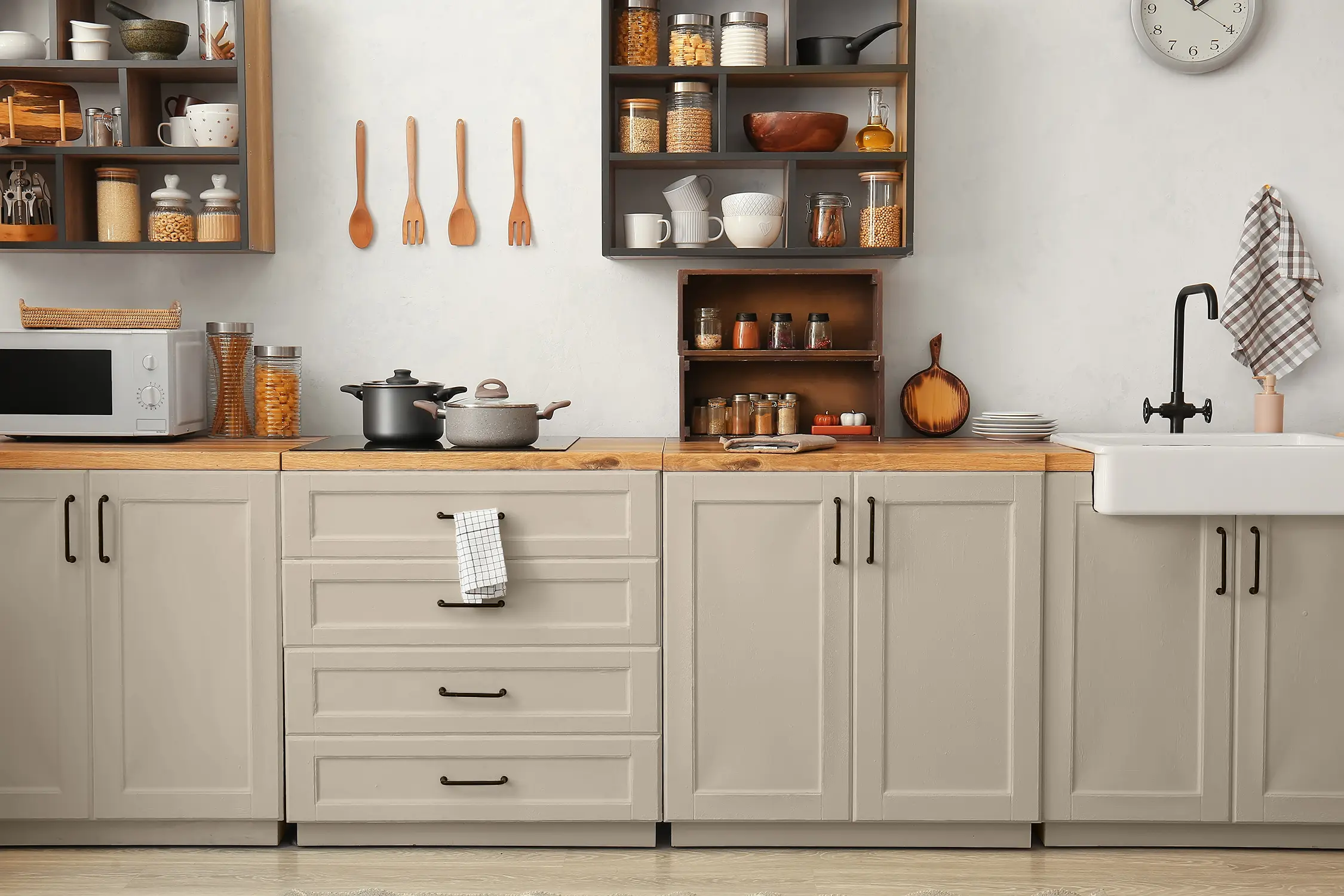 Das beste Ergebnis erhältst du, wenn du den graubeigen Lack in zwei dünnen Schichten aufträgst. Eine Lackrolle mit Schaumstoffaufsatz oder ein weicher Pinsel sind ideal dafür, aber auch ein Auftrag mit einem Spritzgerät ist möglich.