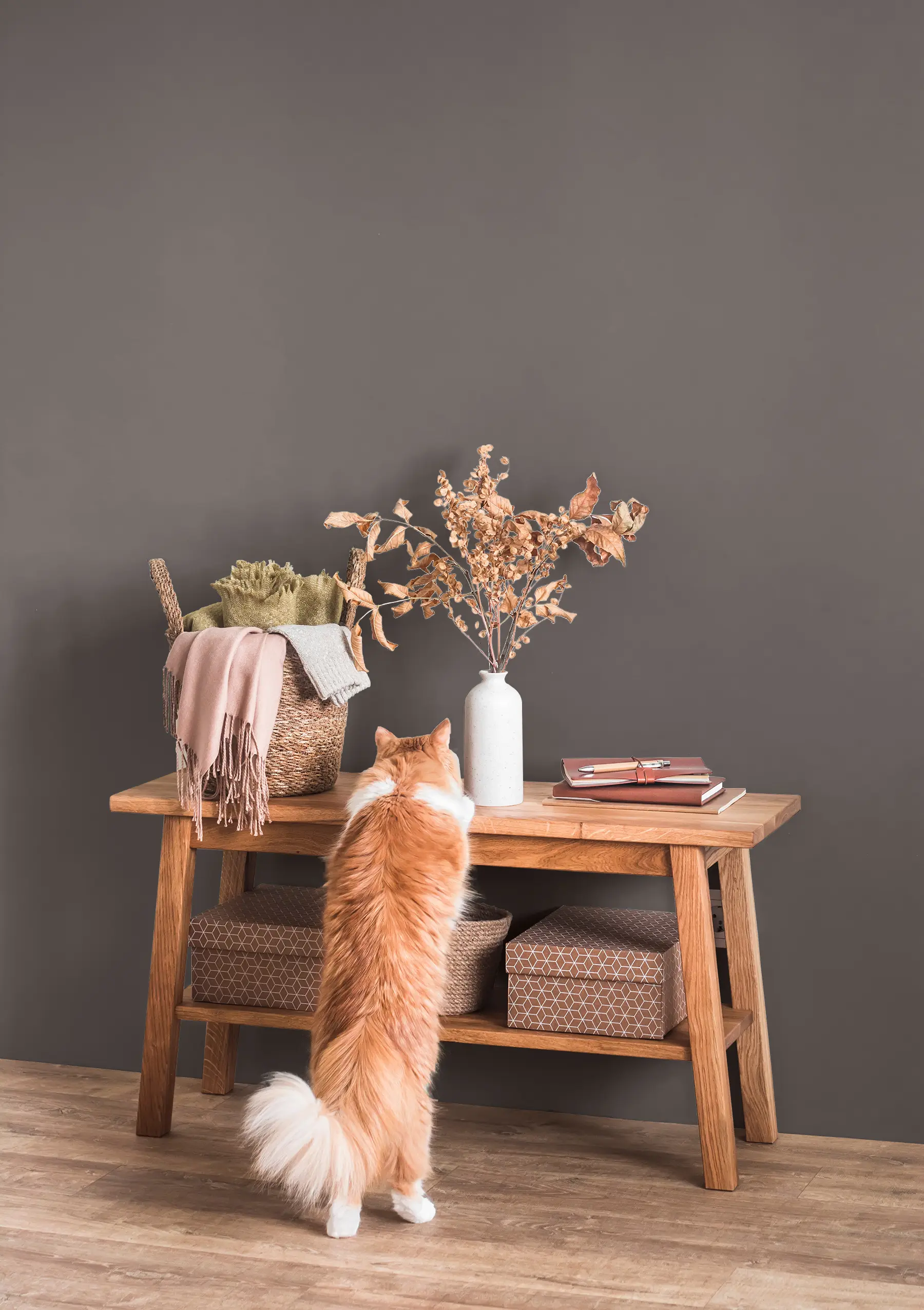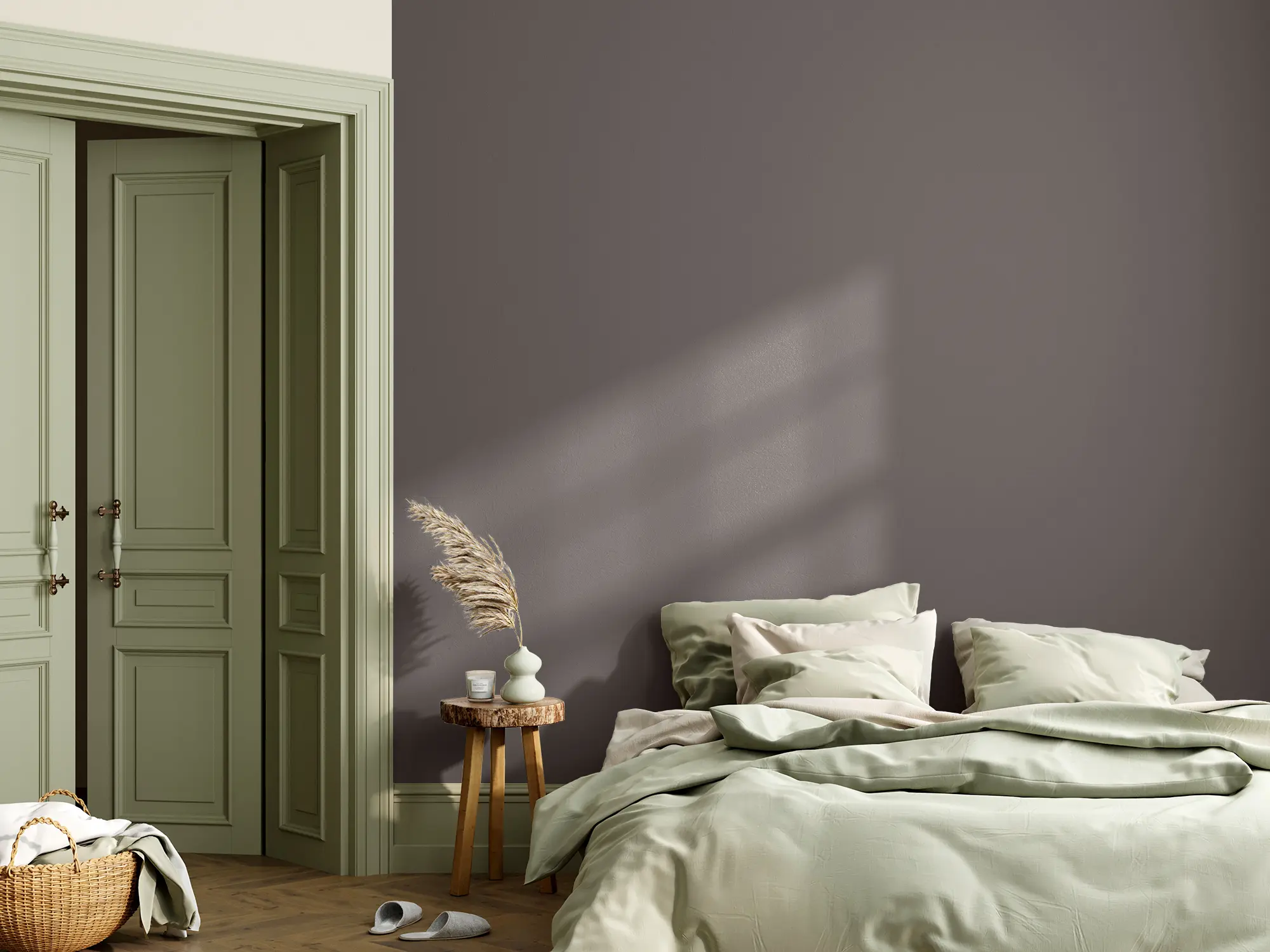 Die Lehmfarbe „Hochmoor" ist ein Braungrau, das eine tiefe Ruhe ausstrahlt und den Raum zu einem Ort der Entspannung macht. Der braune Unterton dieser Farbe sorgt für die extra Portion Gemütlichkeit, weshalb sich „Hochmoor“ besonders für Ruhe- und Schlafbereiche eignet. Im Schlafzimmer kannst du den Farbton auch großflächig verstreichen, um eine besonders beruhigende Stimmung zu erzeugen. In anderen Räumen solltest du ihn gezielt einsetzen und mit helleren Farben kombinieren, damit die Farbwirkung nicht zu drückend erscheint.