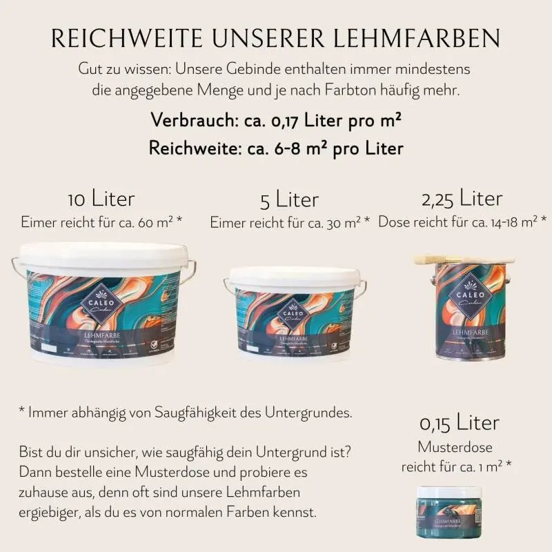 Bist du dir unsicher, welchen Ton oder welche Menge du bestellen solltest? Dann helfen dir unsere Musterdosen. Wähle oben einfach die Option 0,15 L und probiere die Farben zuhause aus. So bekommst du einen ersten Eindruck von unserer Lehmfarbe, kannst abschätzen wie saugfähig dein Untergrund ist und wie viel Farbe du bestellen solltest. Zudem siehst du, wie der Farbton bei den Lichtverhältnissen in deinem Raum wirkt. Auch für Wandbilder oder eignen sich unsere Musterdosen perfekt, denn sie reichen etwa für einen 1qm Fläche.