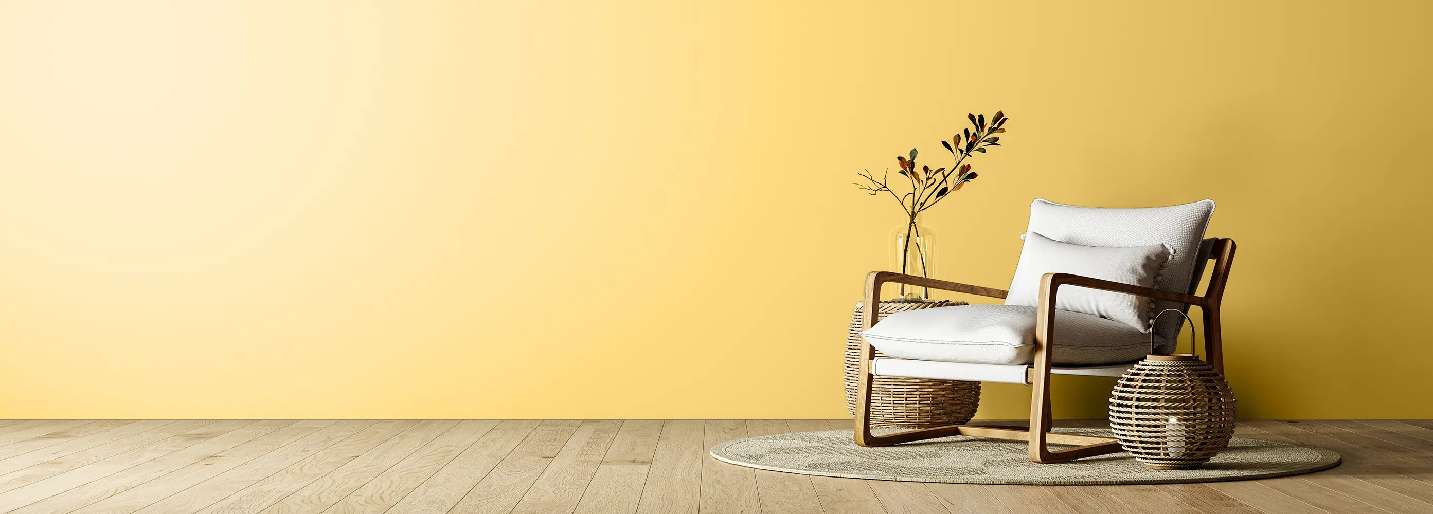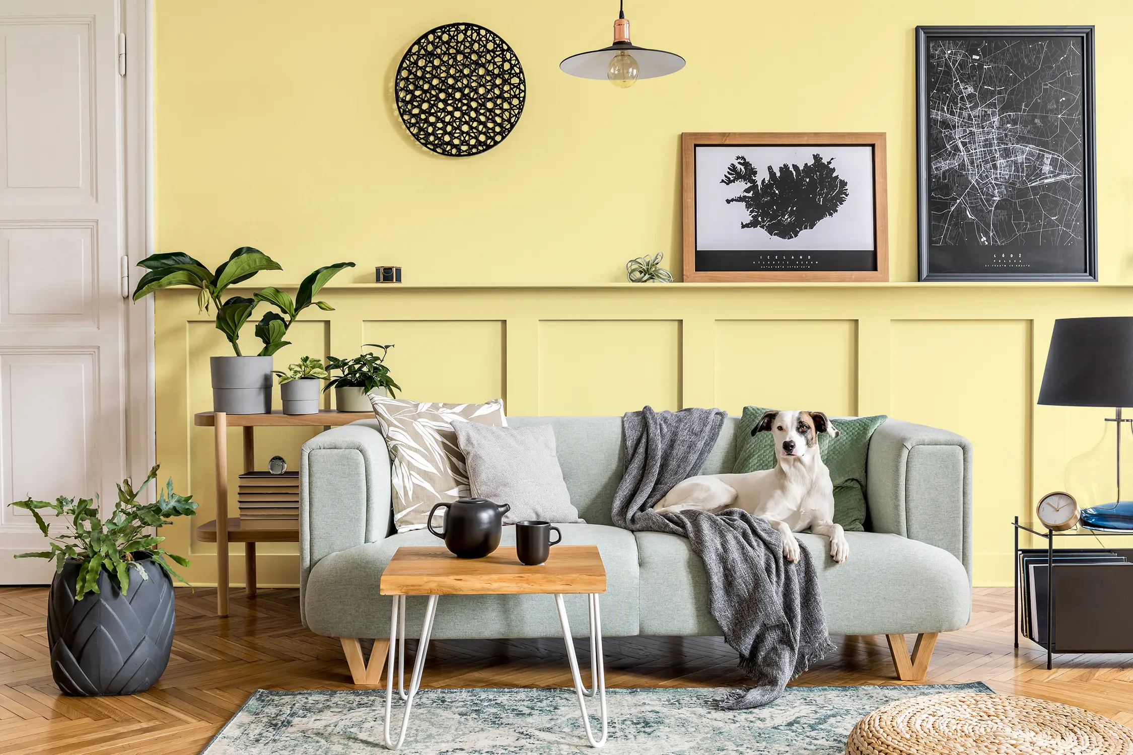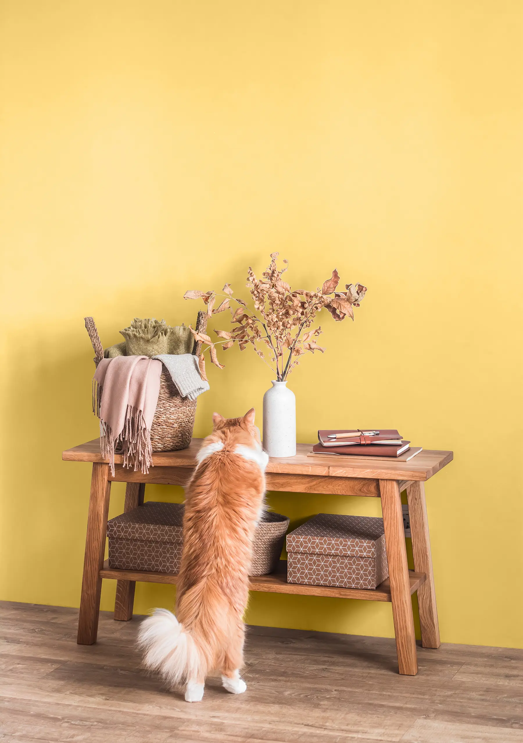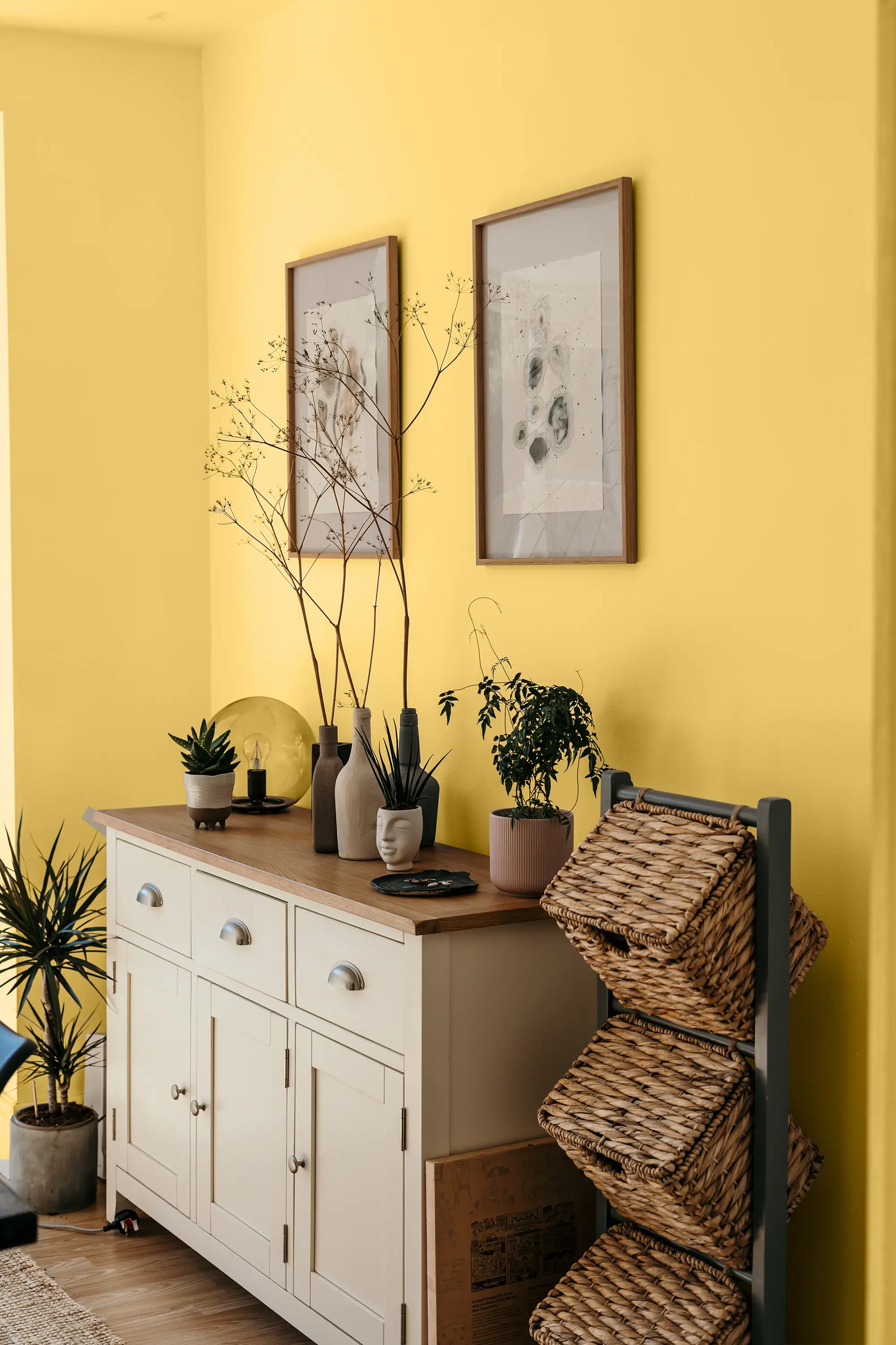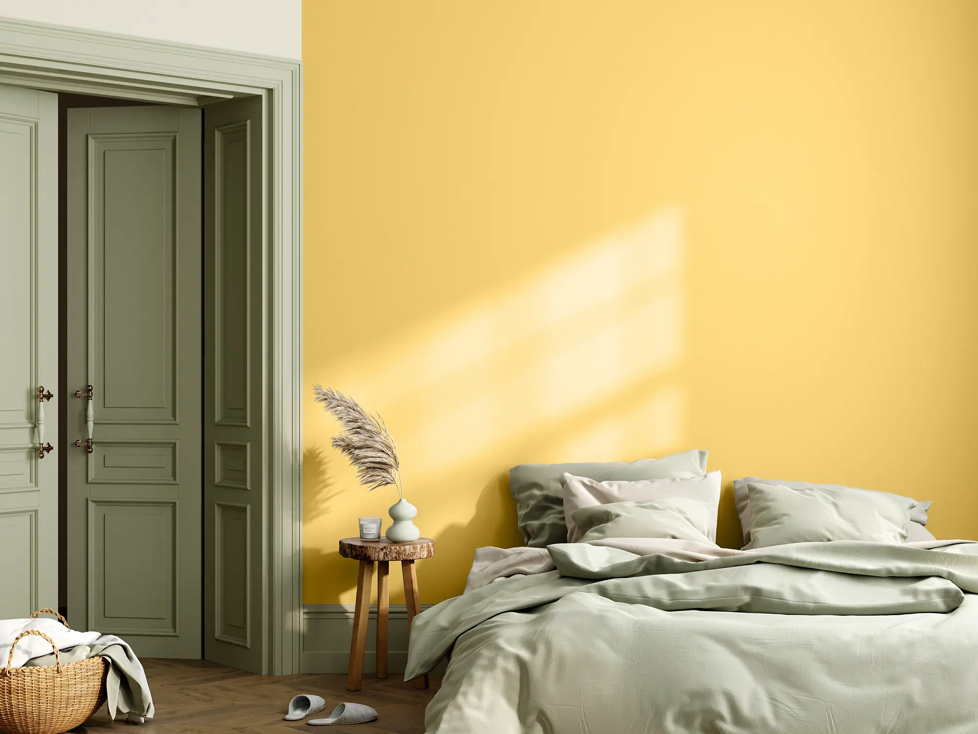 Caleo-Tipp: Wenn du weiße Wände dezent aufpeppen möchtest, kannst du eine zarte Farbe wie "Kükenflaum" dafür nutzen. Indem du geometrische Formen an einer Wand oder in einer Zimmerecke aufmalst, ergibt sich ein freundliches und anregendes Gesamtergebnis. Mithilfe dieser Technik kannst du den Raum auch in verschiedene Funktionsbereiche unterteilen. Da die Farbe Gelb die Konzentration und Kreativität fördern soll, kannst du sie zum Beispiel in einer Arbeits- oder Leseecke verwenden.