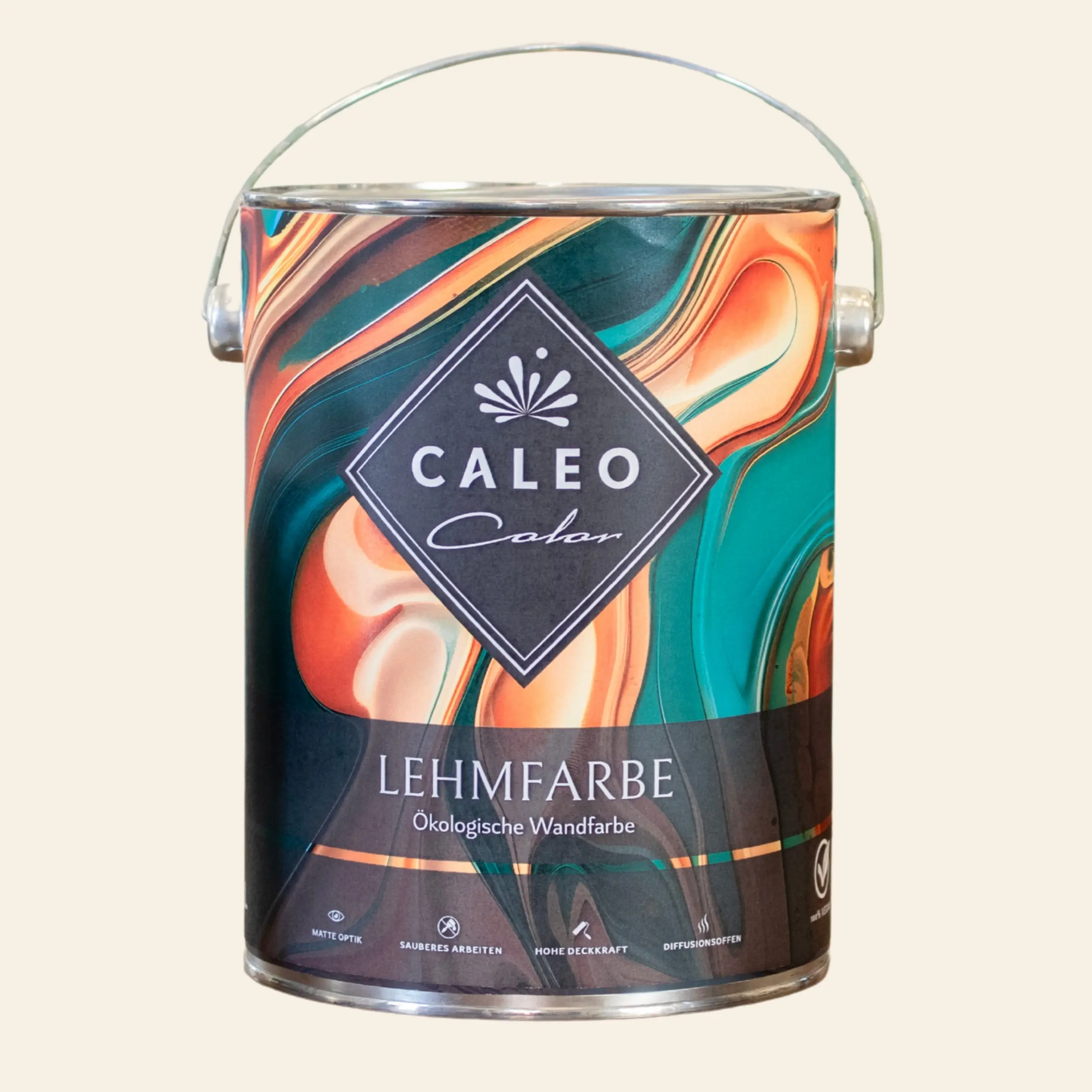 Die beige Wandfarbe "Lammwolle" von Caleo Color ist eine natürliche Lehmfarbe mit vielen positiven Eigenschaften. Mit ihr gestaltest du den Raum optisch ansprechend und unterstützt dabei sogar noch ein angenehmes Raumklima. Gegenüber konventionellen Wandfarben mit Kunststoffanteilen besitzt die streichfertige Lehmfarbe eine Reihe positiver Eigenschaften. In Verbindung mit einem atmungsaktiven Untergrund wie Lehmputz kann die Caleo Color-Lehmfarbe feuchteregulierend wirken und das Raumklima positiv beeinflussen. Zudem binden die enthaltenen Tonmehle schlechte Gerüche und neutralisieren diese. Außerdem verzichten wir in unseren Lehmfarben auf chemische Lösemittel und Weichmacher.