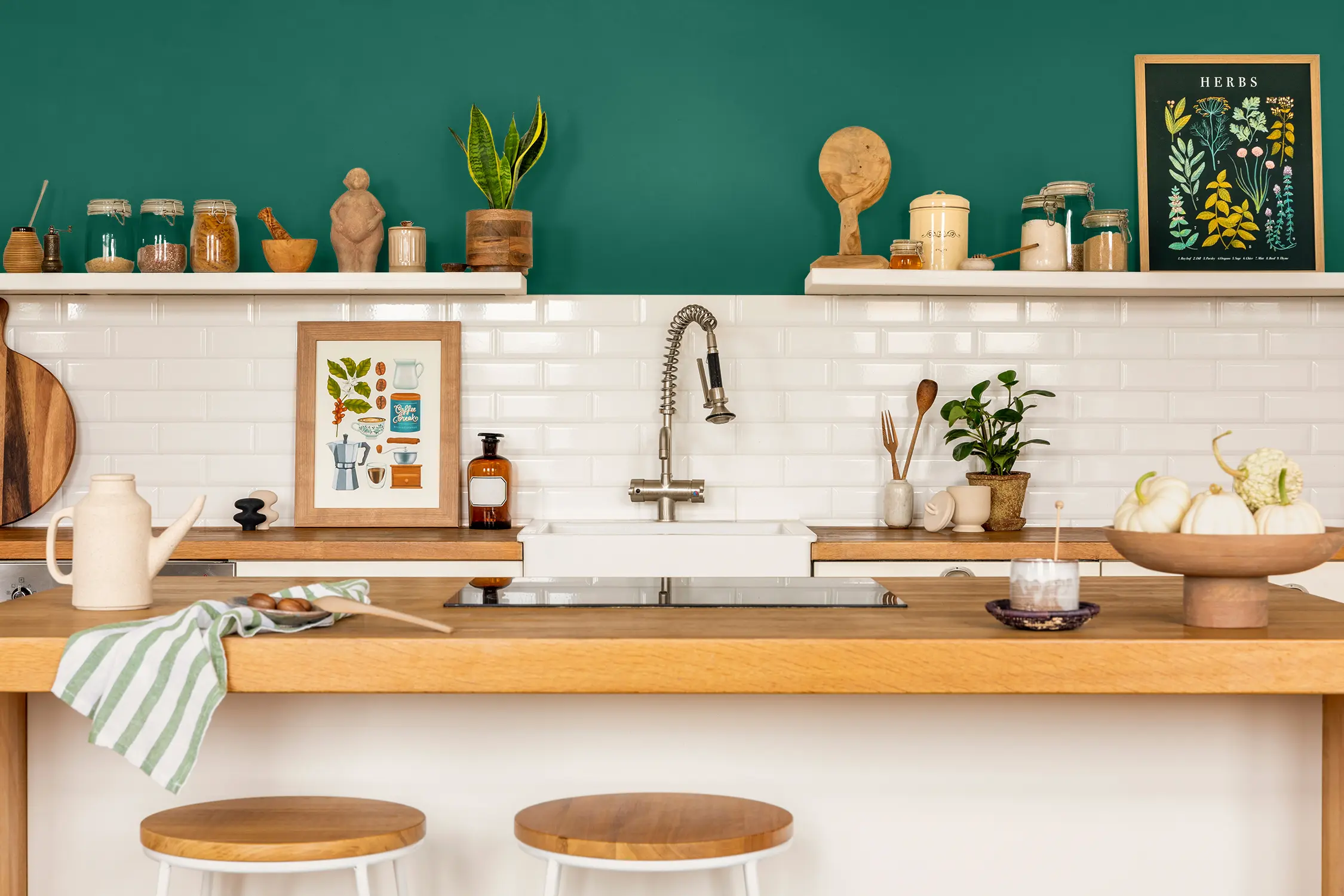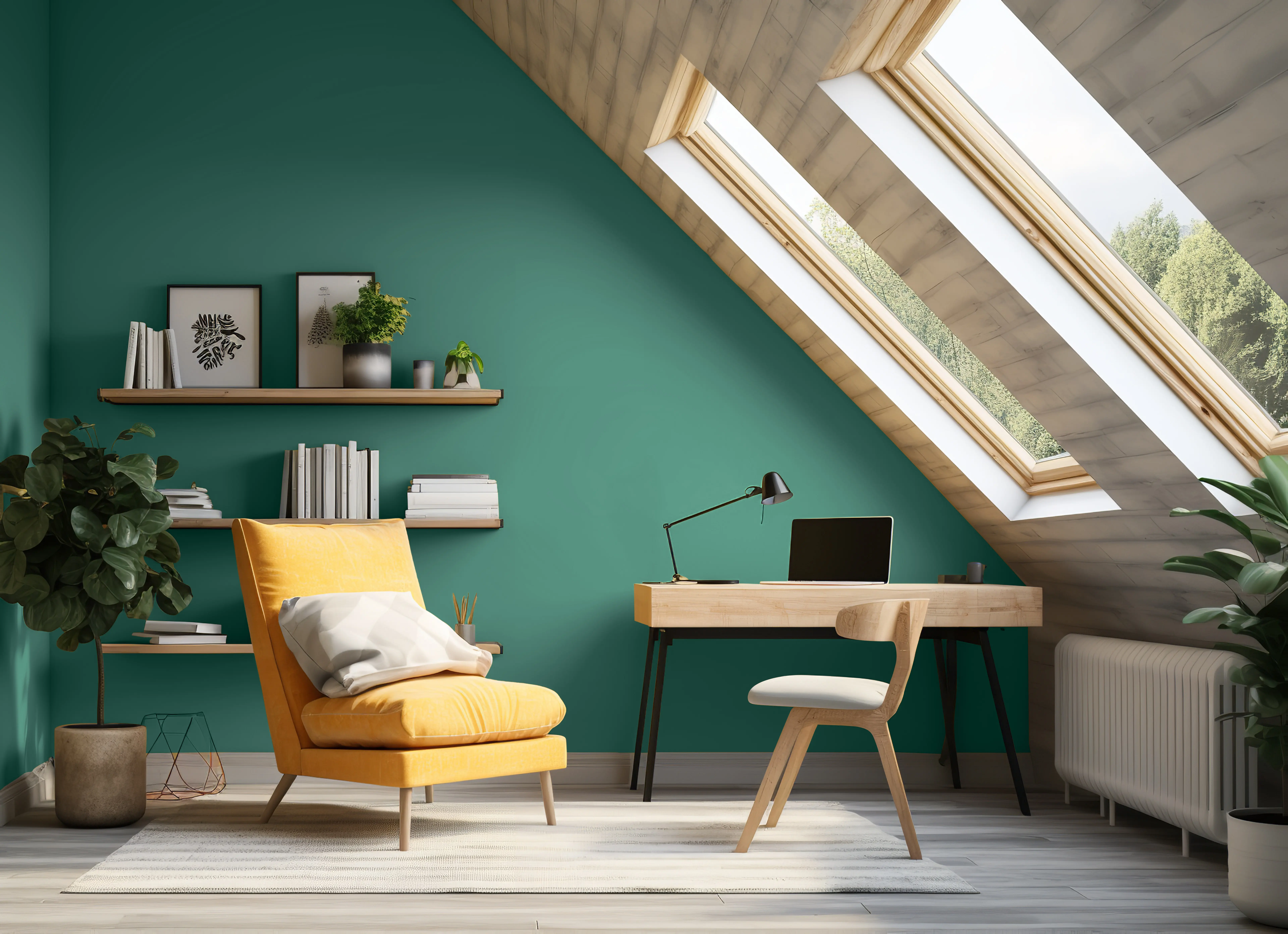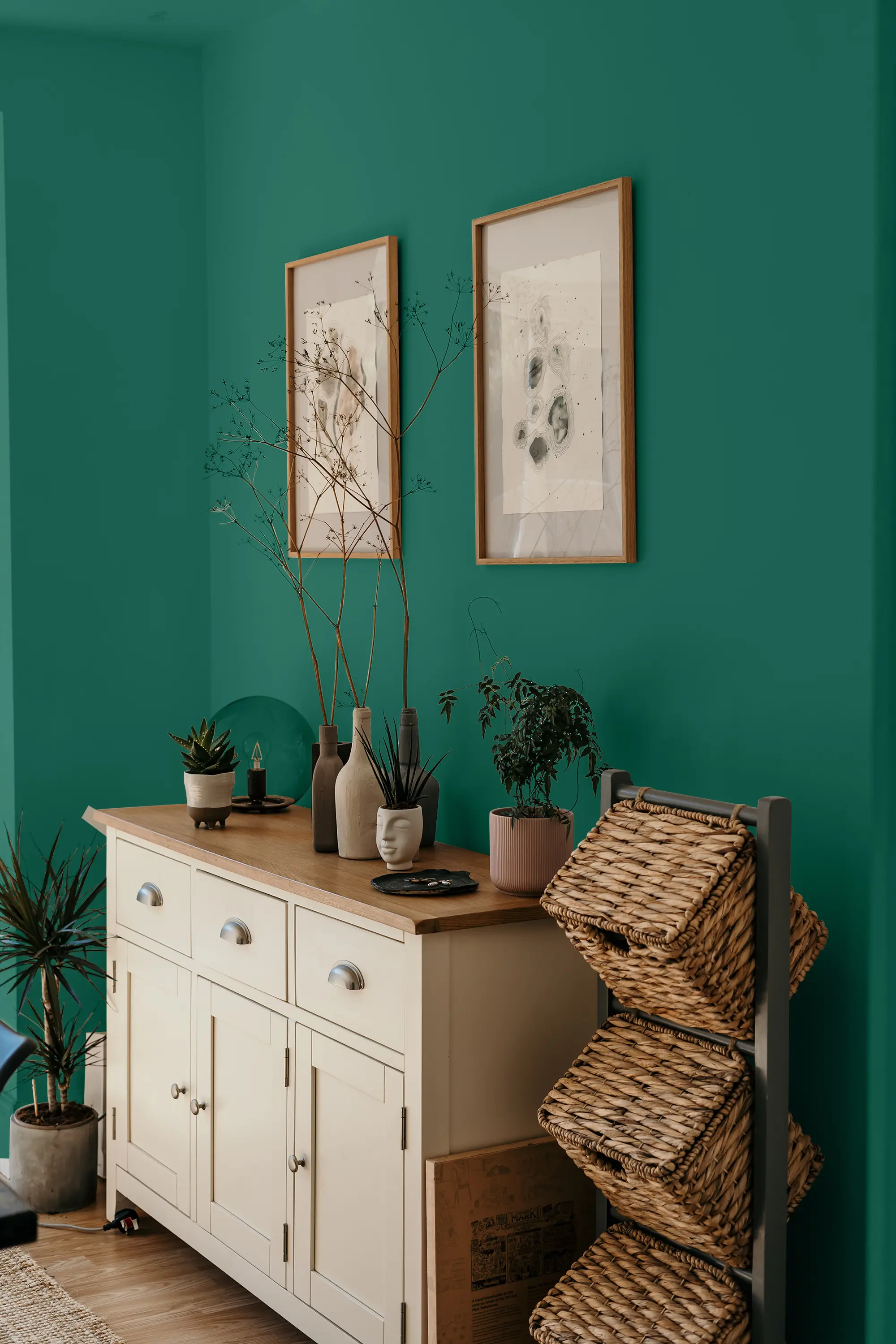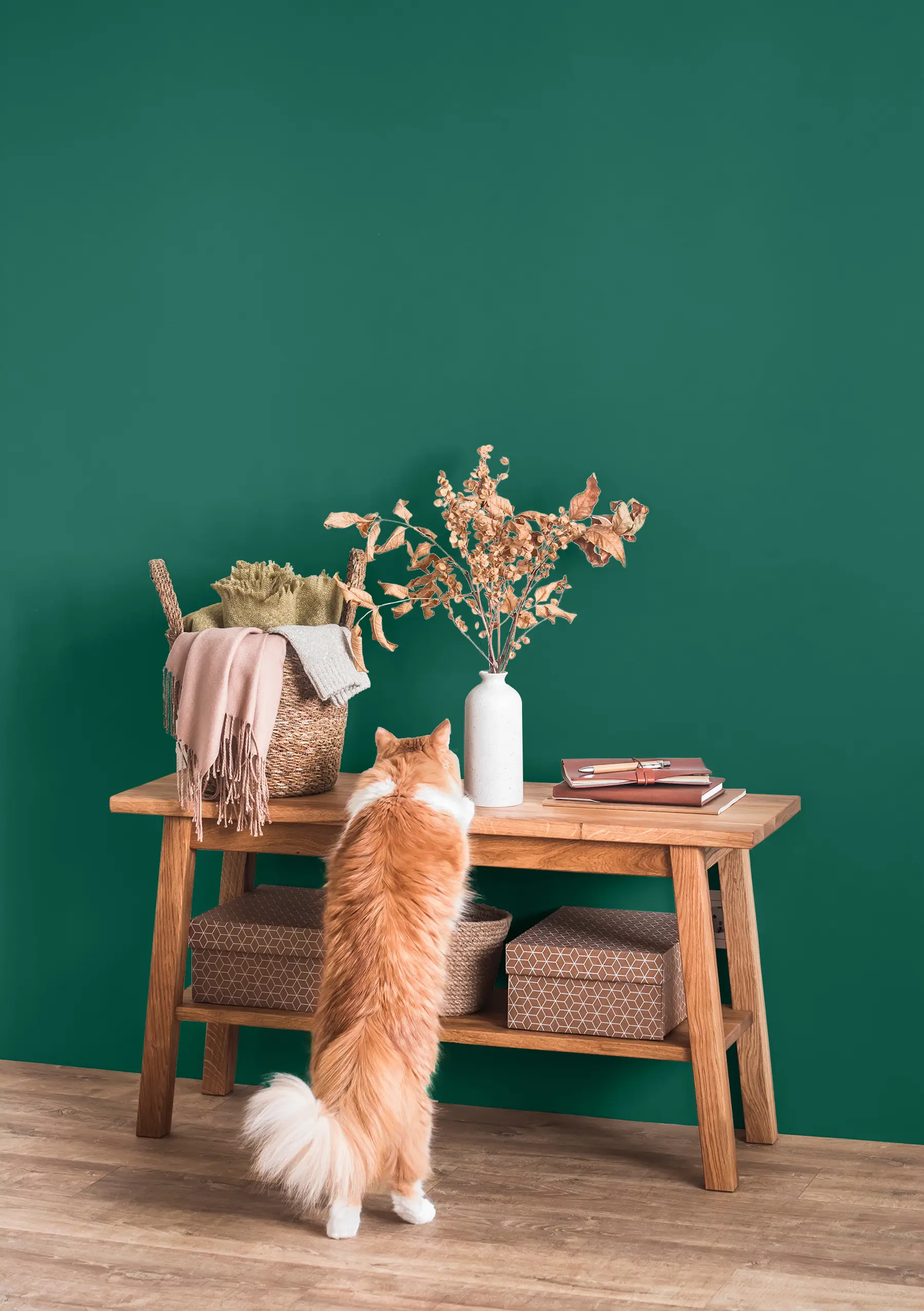 Das kräftige Dunkelgrün "Palmenblatt" erinnert an das intensive Grün eines exotischen Waldes und schafft eine frische und ausgeglichene Atmosphäre im Raum. In lichtdurchfluteten Zimmern kannst du "Palmenblatt" großflächig an mehreren Wänden verstreichen. Bei kleinen oder eher dunklen Räumen bietet es sich an, die Farbe als Akzent in einzelnen Bereichen oder in Kombination mit hellen Farbtönen einzusetzen.