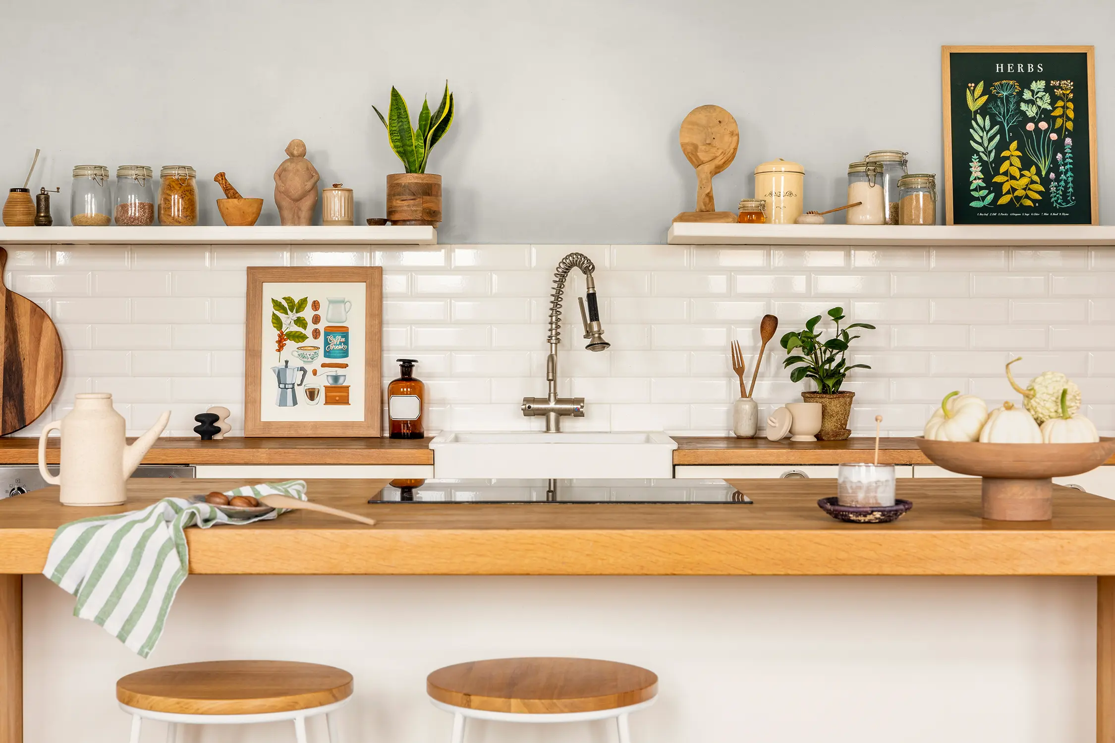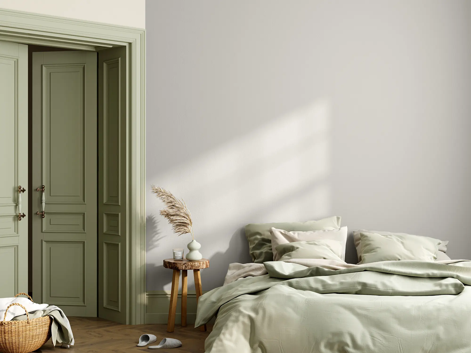 Helle und neutrale Farbtöne wie „Raureif“ sind die ideale Grundlage, um kräftige Farbakzente oder natürliche Materialien wie Holz ausdrucksstark zur Geltung zu bringen.