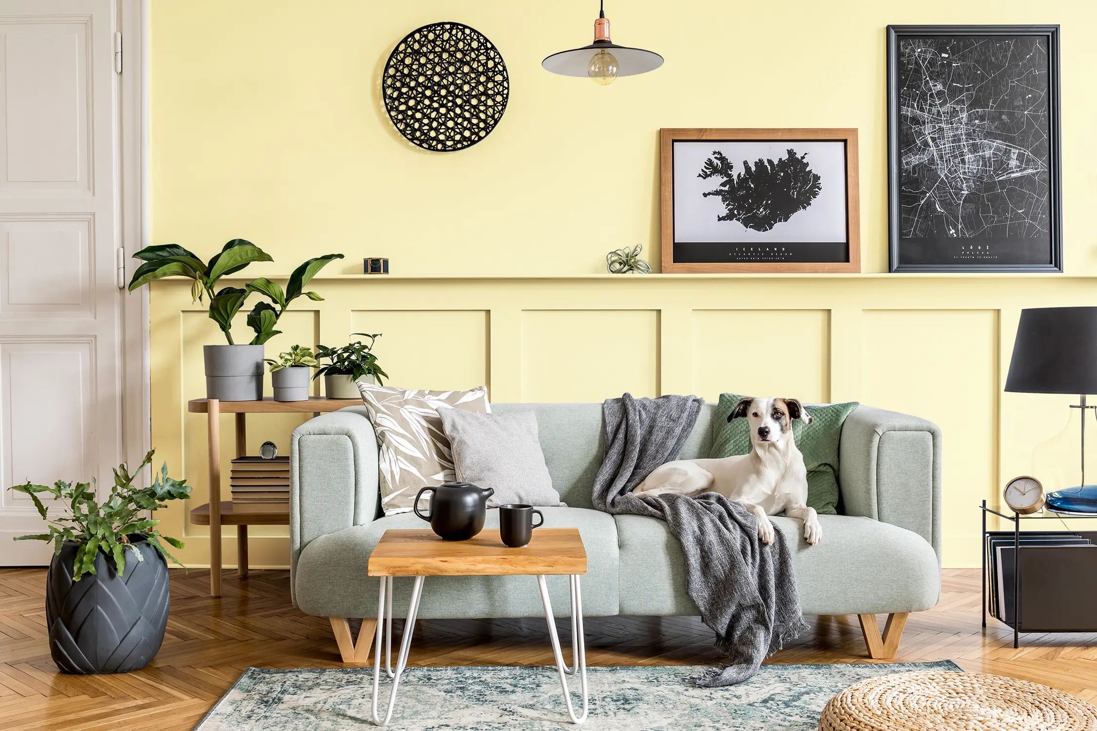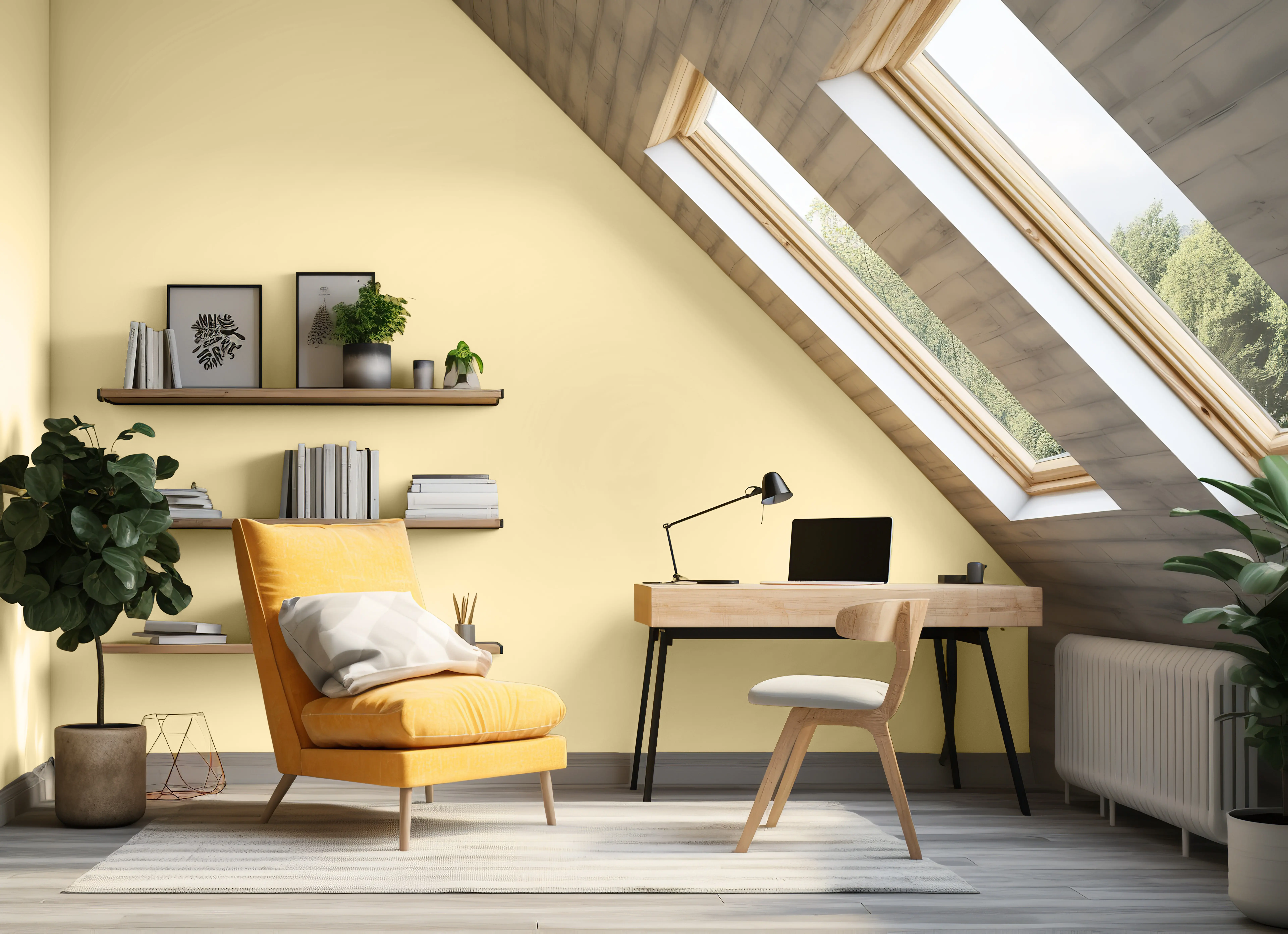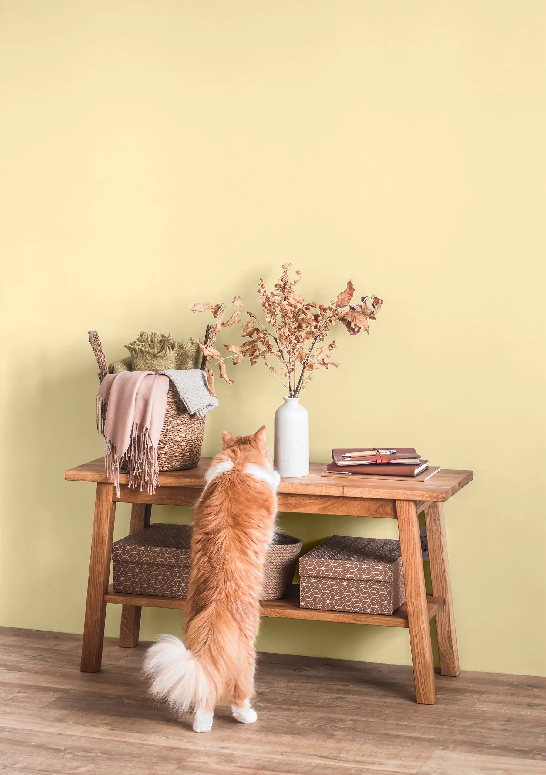 Caleo-Tipp: "Sandwirbel" ist eine sehr schlichte Farbe. Daher empfiehlt es sich, diesen warmen Beigeton in einem harmonischen Farbkonzept mit ein oder zwei kräftigen, strahlenden Farben zu verwenden. Statt Wandfarben kannst du aber auch Wohntextilien wie Decken, Kissen und Vorhänge nutzen, um farbliche Kontraste im Raum zu schaffen.