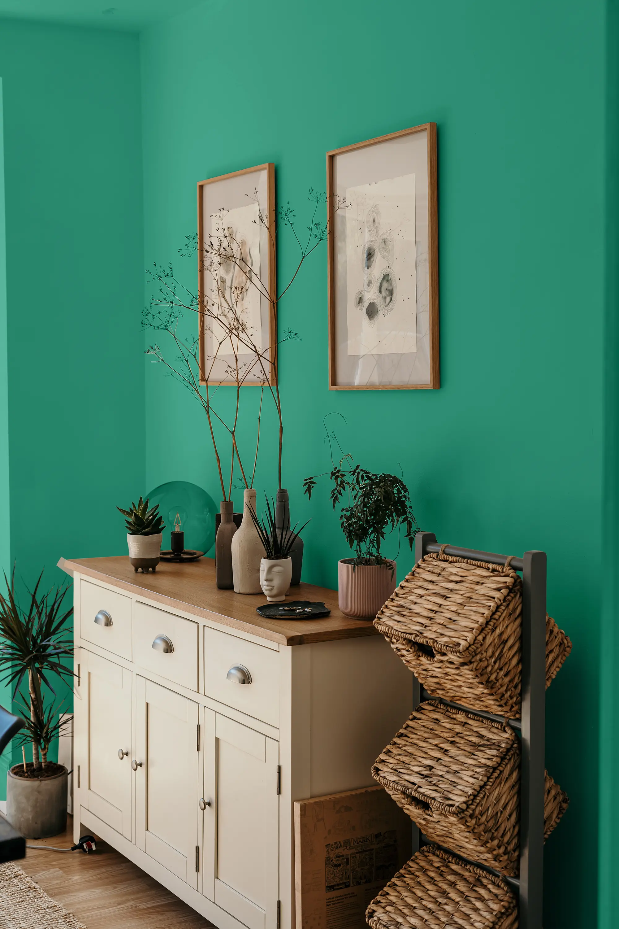Die Lehmfarbe "Smaragd" in Petrol ist eine kräftige Kontrastfarbe. Sie verbindet die anregende und inspirierende Wirkung von Grün mit einer beruhigenden und konzentrationsfördernden Nuance von Blau. Das leuchtende Petrol "Smaragd" sorgt als Wandfarbe daher für eine aufmunternde Frische, die sich positiv auf die Kreativität und Konzentration auswirken kann. Nutze diesen Farbton am besten, um knallige Kontraste an der Wand zu setzen oder um Arbeits- und Kreativbereiche optisch abzugrenzen.