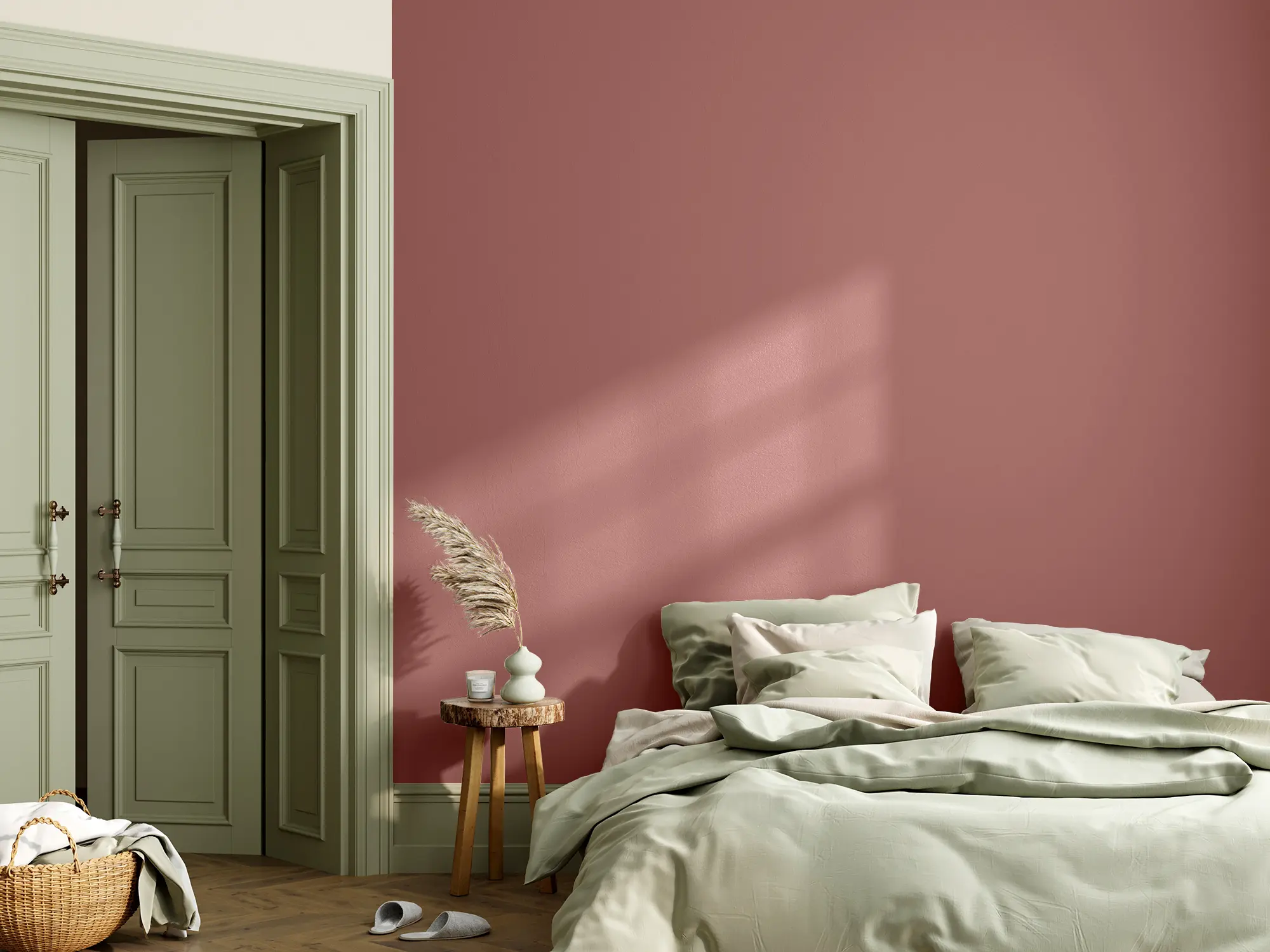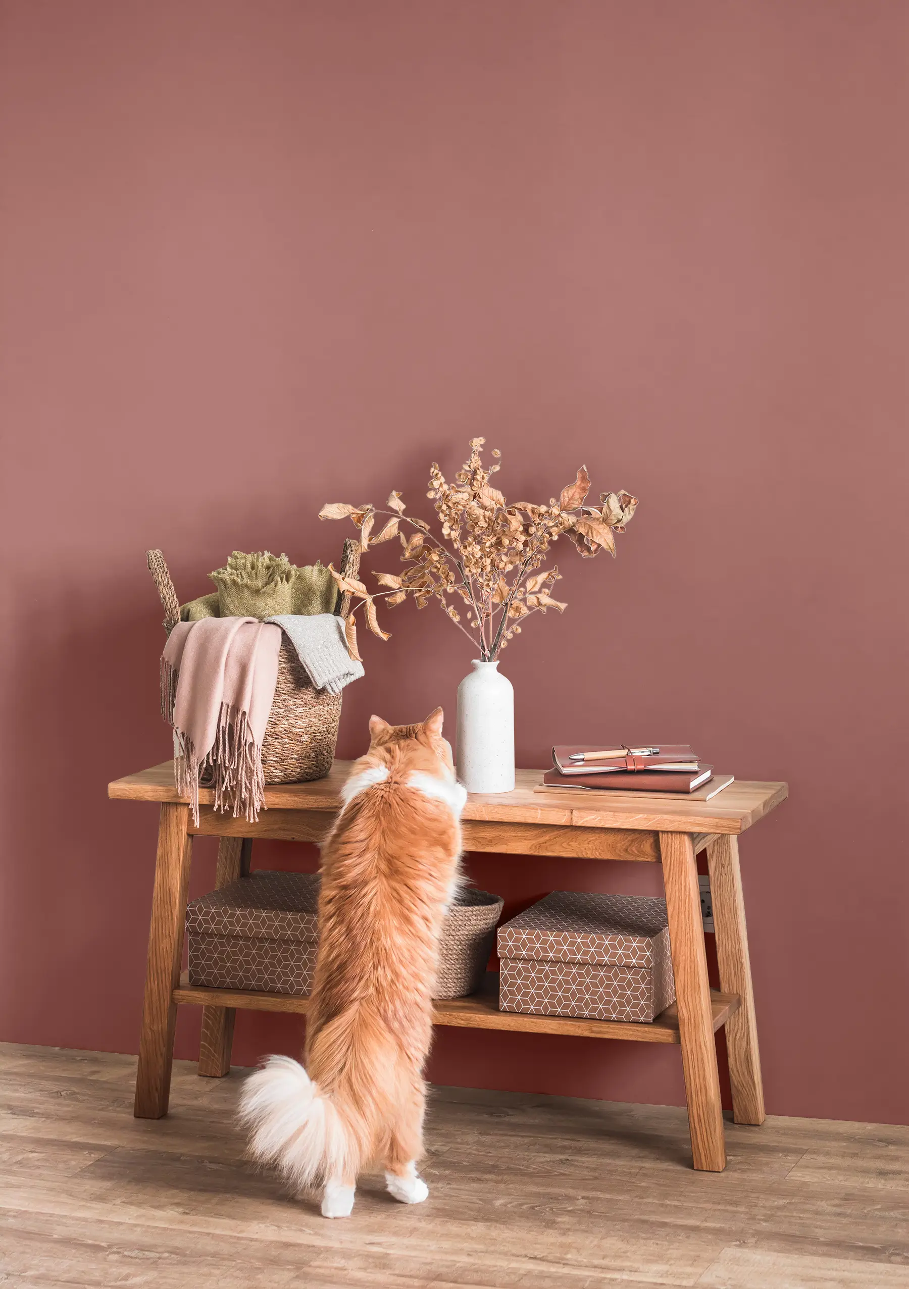 Die Lehmfarbe „Sommerabend“ in Rotbraun strahlt Wärme und Geborgenheit aus. Der eher dunkle Farbton kann große, sehr helle Räume gemütlicher machen und sorgt für eine schöne Wohlfühlatmosphäre. Natürlich kannst du den Braunton auch in kleineren Räumen verstreichen, solltest hier aber auf eine passende Farbe zum Auffangen achten, damit der Raum nicht zu drückend wirkt.
