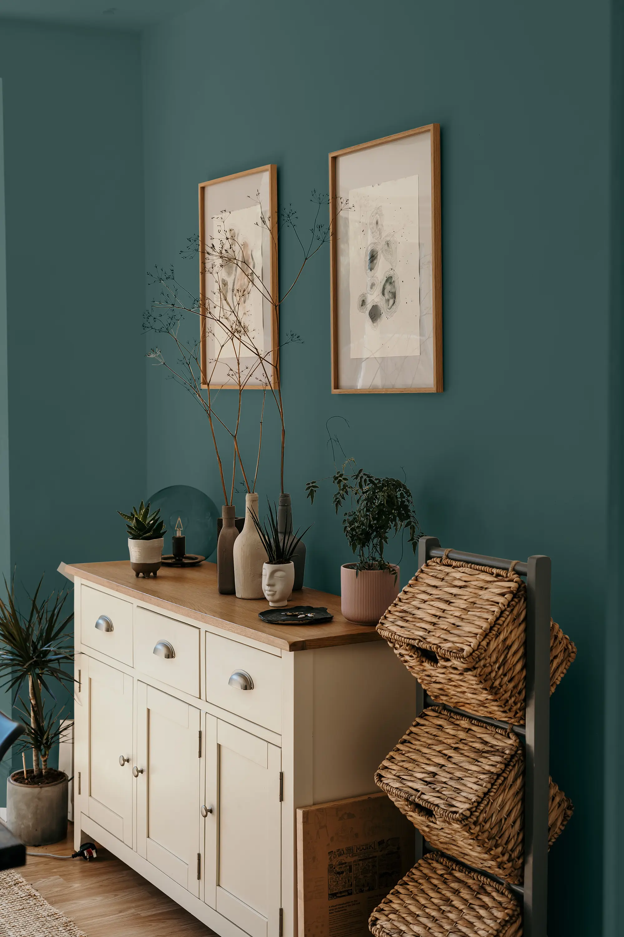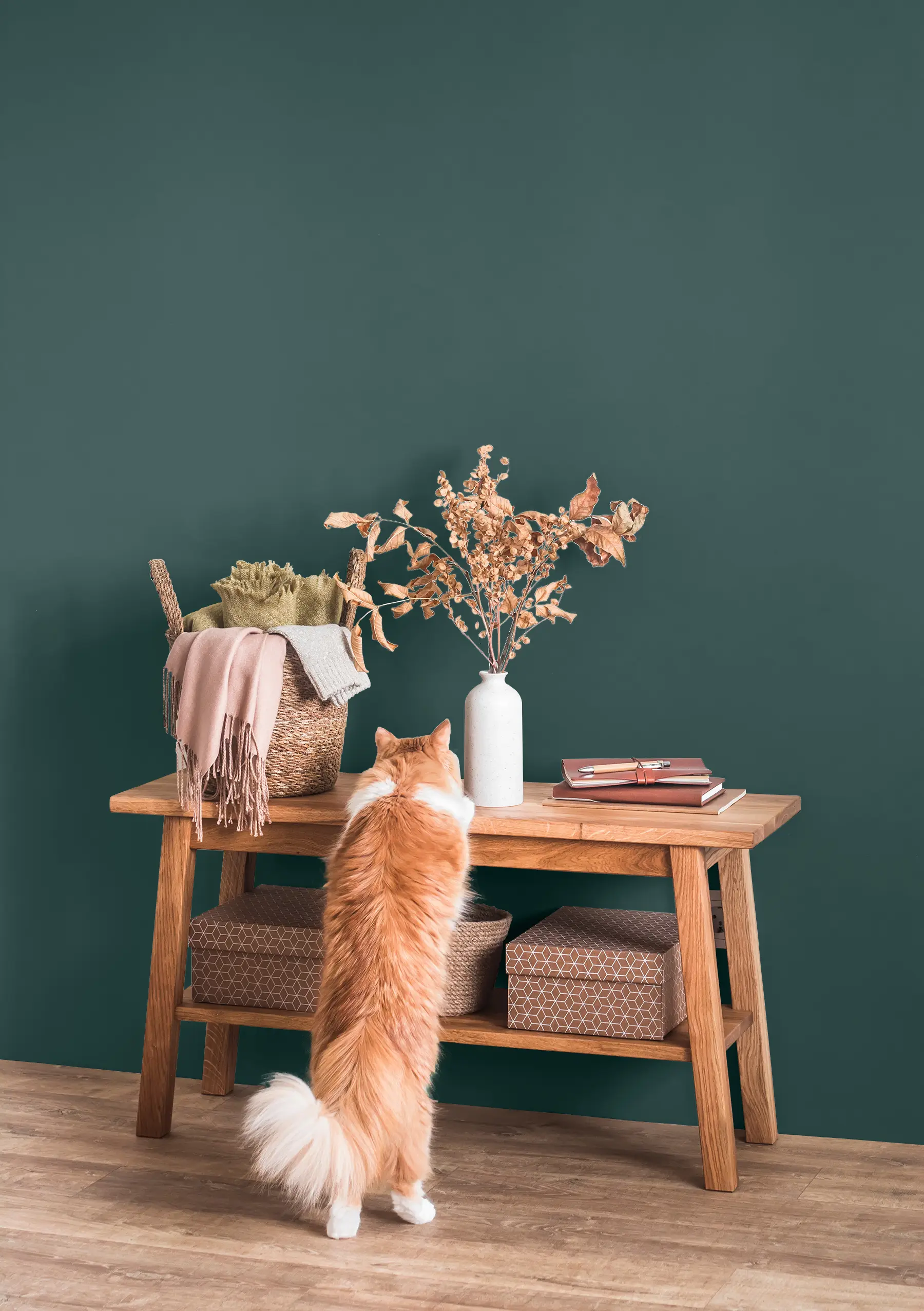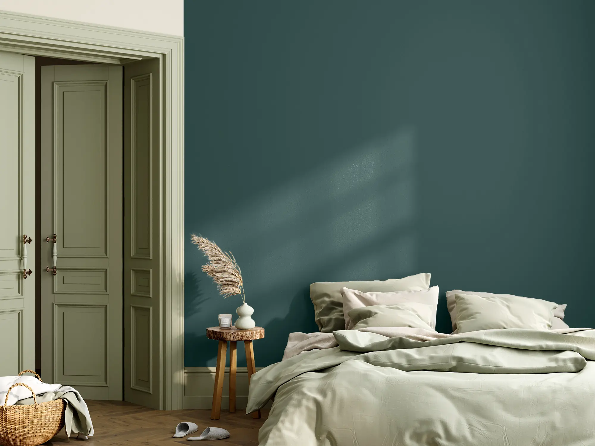 Die Lehmfarbe „Waldspaziergang“ ist ein kräftiges Dunkelgrün mit einem bläulichen Unterton, der dem Farbton eine besondere Tiefe und Ruhe verleiht – wie ein Spaziergang in einem dichten Wald. Das Dunkelgrün eignet sich hervorragend für Kontrastwände, die für einen tollen Blickfang in deiner Wohnung sorgen. Damit der Raum nicht zu dunkel wird, solltest du den Farbton dosiert als Akzentfarbe einsetzen. Im Schlafzimmer oder in sehr hellen Räumen mit viel Tageslicht kannst du „Waldspaziergang“ jedoch durchaus auch großflächig verstreichen.