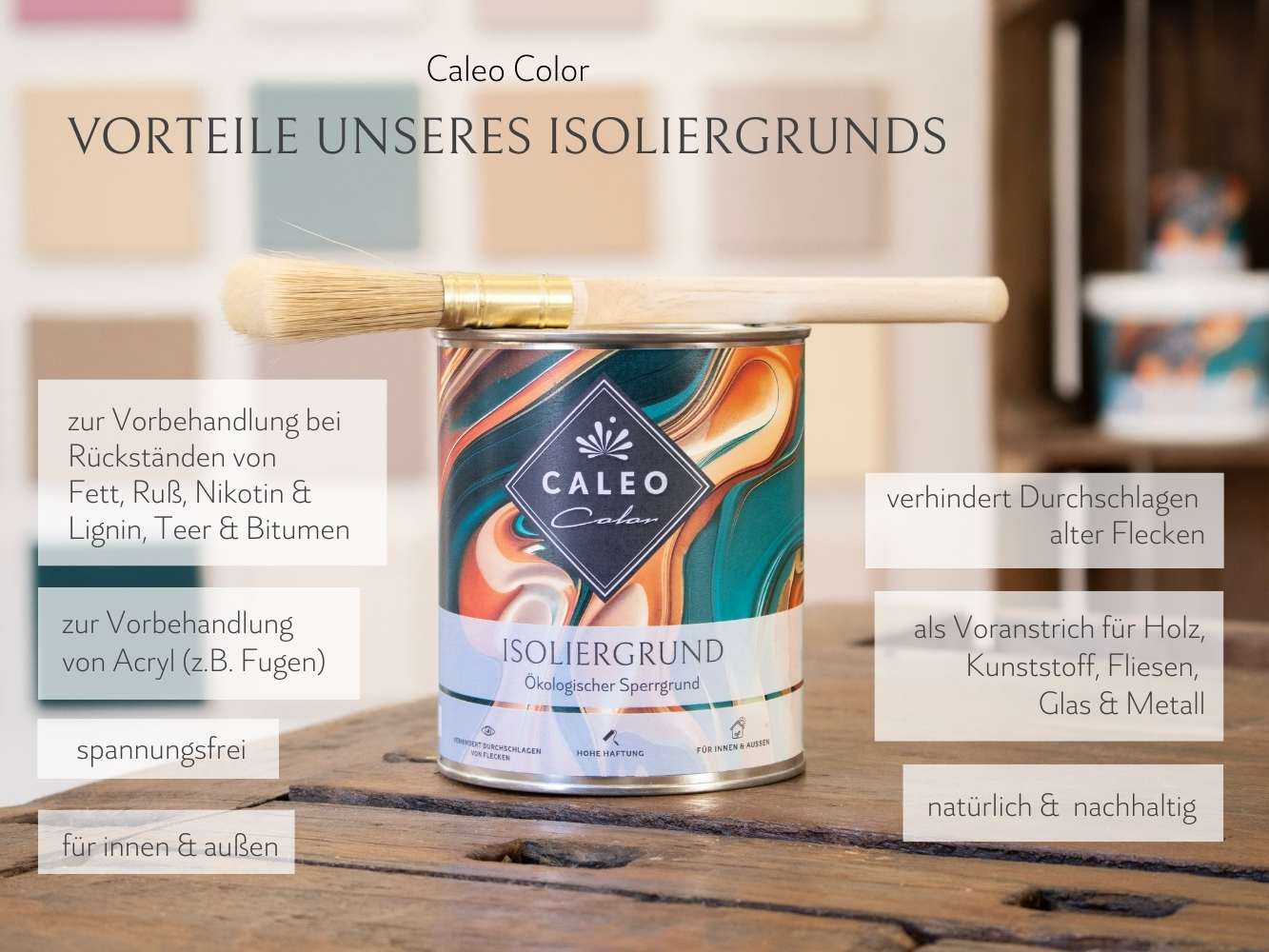 Je nach Untergrundbeschaffenheit benötigst du ca. 100 – 150 ml/m2 Isoliergrund. Die Verwendung selbst ist kinderleicht. Unser Isoliergrund ist streichfertig angemischt, aber sollte vor Gebrauch ordentlich geschüttelt werden. Auftragen lässt sich der Caleo Color Isoliergrund am besten mit einem Pinsel oder einer Malerrolle. Nach ca. 4-6 Stunden ist der Auftrag getrocknet und nach ca. 24 Stunden überstreichbar.