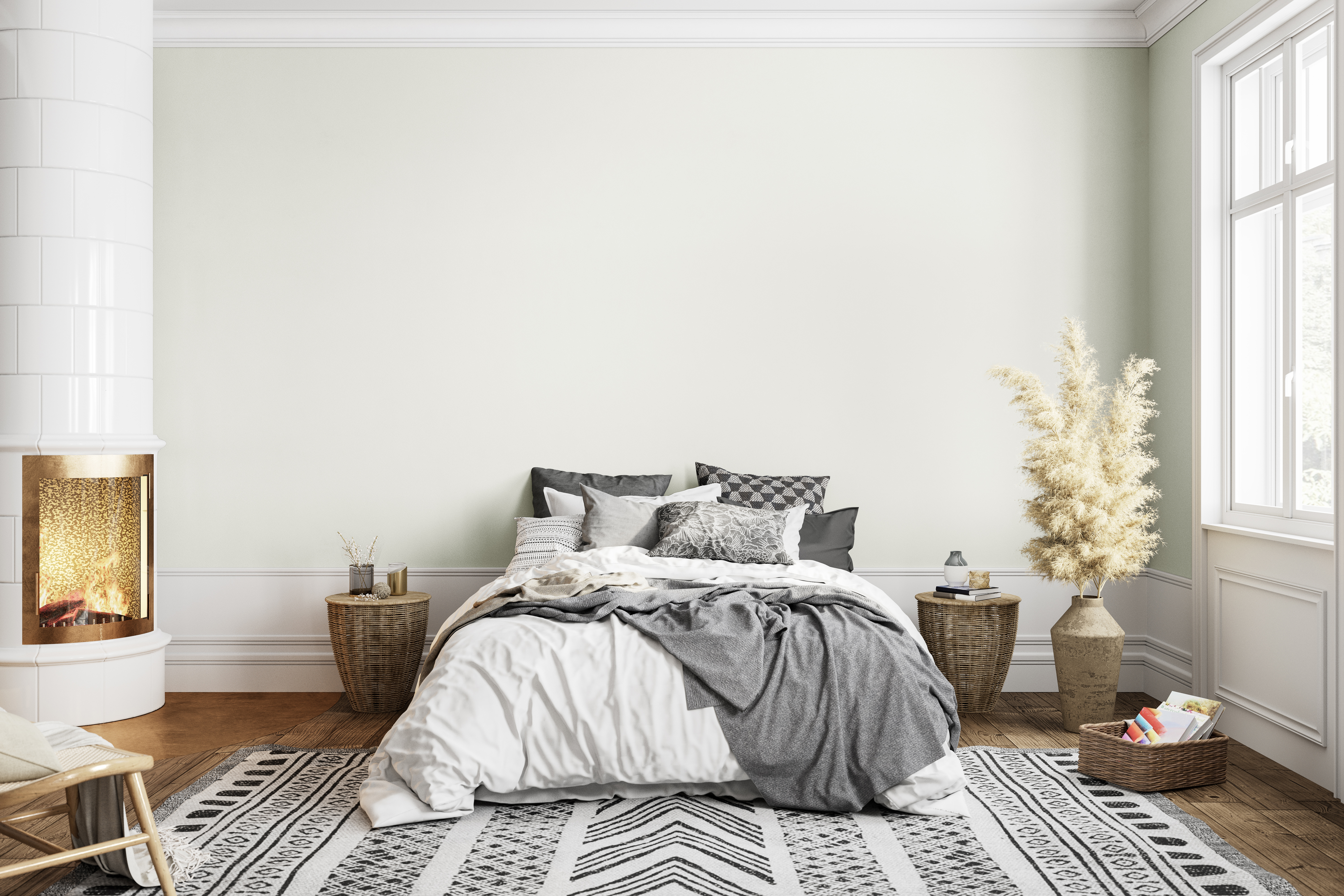 Im Boho-Stil spielen warme Farben und natürliche Materialien eine große Rolle. Beigetöne wie „Pampasgras“ oder „Königsfelsen“ sind hier die perfekte Basis, da sie mit Holzmöbeln, Naturmaterialien, bunten Ethno-Mustern und kräftigeren Erdtönen harmonieren. Kombiniert mit Grünpflanzen und orientalisch inspirierten Accessoires entsteht ein lebendiger, aber gemütlicher Look.