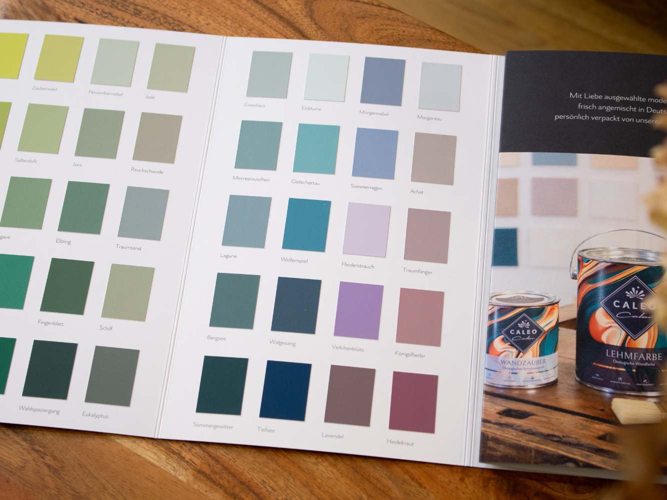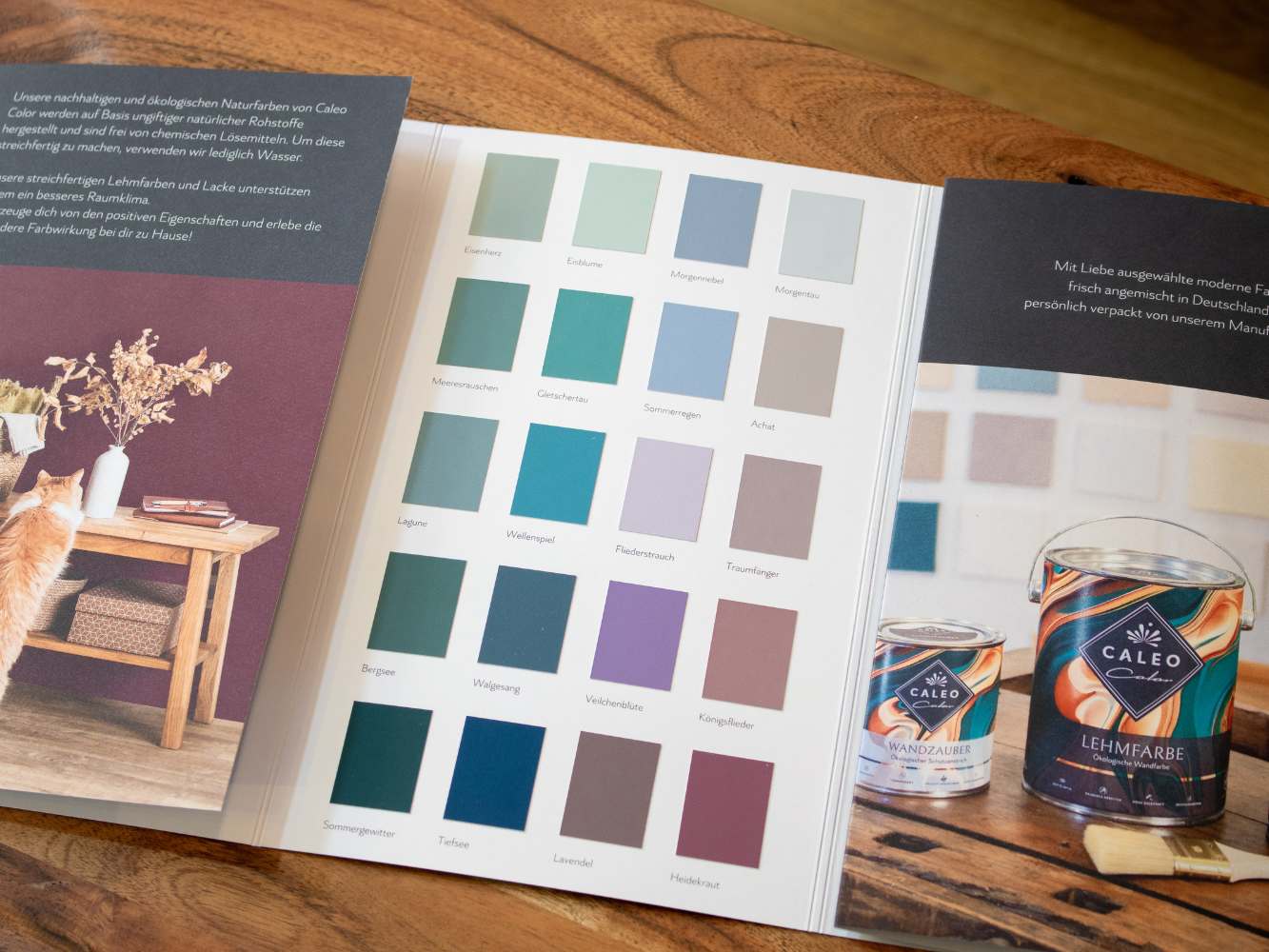 Auf unserem hochwertigen Farbkatalog findest du alle 103 Caleo Color-Farbtöne. Zudem kannst du dir anschauen, wie sich die Oberfläche der matten Lehmfarben und der seidenmatten Lacke unterscheidet.