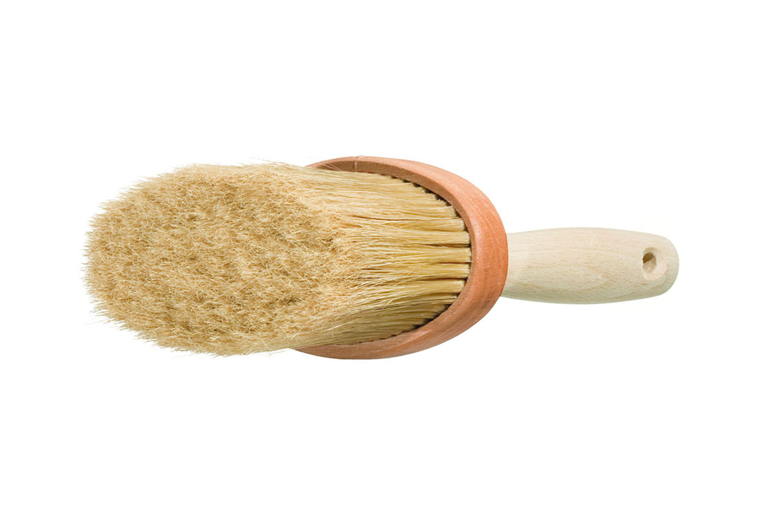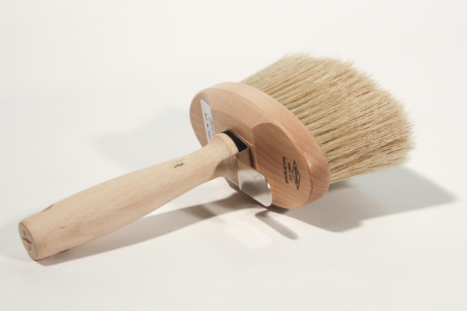 Die hochwertige Fassadenbürste besteht aus einem ovalen Holzstück, in das die hellen Borsten eingefasst sind. An diesem Holzkörper ist ein Holzgriff angebracht. Die Fassaden-Streichbürste hat eine Länge von 130mm und eine Breite von 55mm. Die hellen Borsten sind 65mm lang.