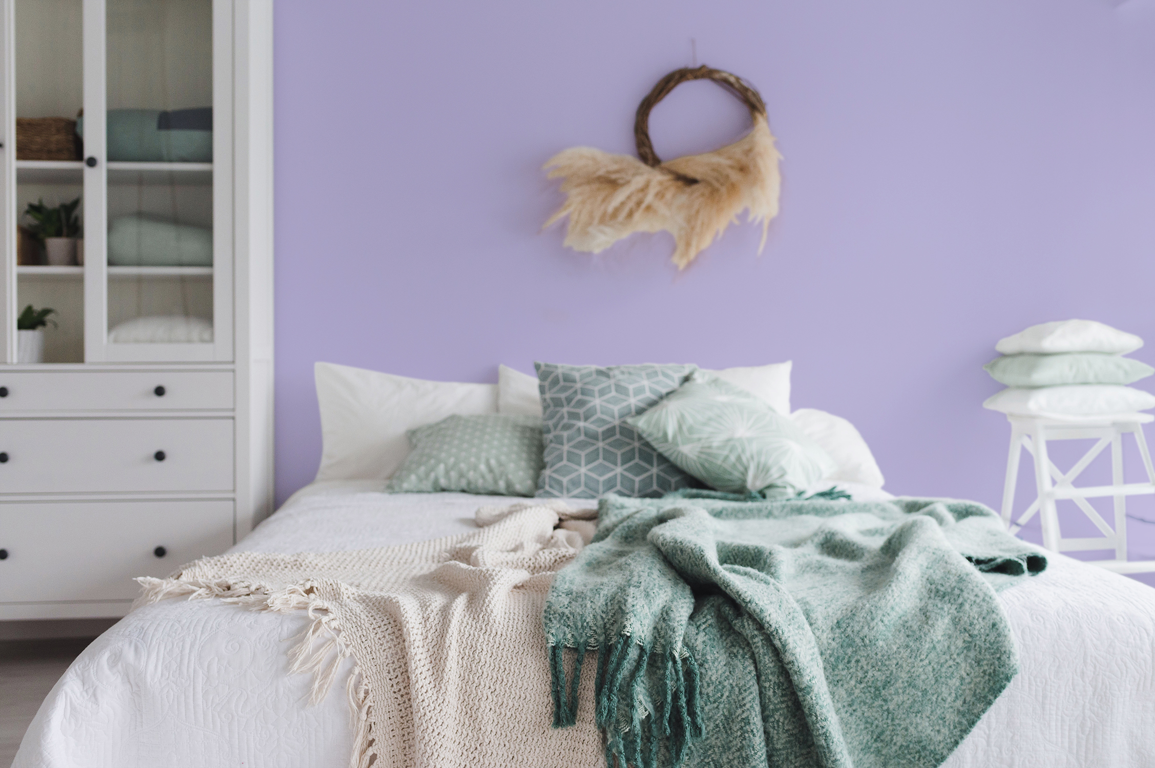 Eine weitere Abwandlung von Rot ist unsere Wandfarbe in Lila „Veilchenblüte“. Aufgrund derselben Farbfamilie lässt sich das kräftige Lila wunderbar mit anderen Rot- und Rosatönen kombinieren. Naturbelassene massive Holzmöbel oder weiß gestrichene Holzmöbel wirken hier sehr edel und tragen zu einem wohngesunden Raumklima bei.