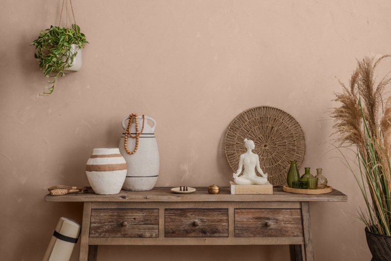 - Accessoires & Deko: Während minimalistische Stile eher zurückhaltend dekorieren, stehen im Ethno-Style kunstvolle und auffällige Deko-Elemente, Textilien und handgefertigte Details im Mittelpunkt.
