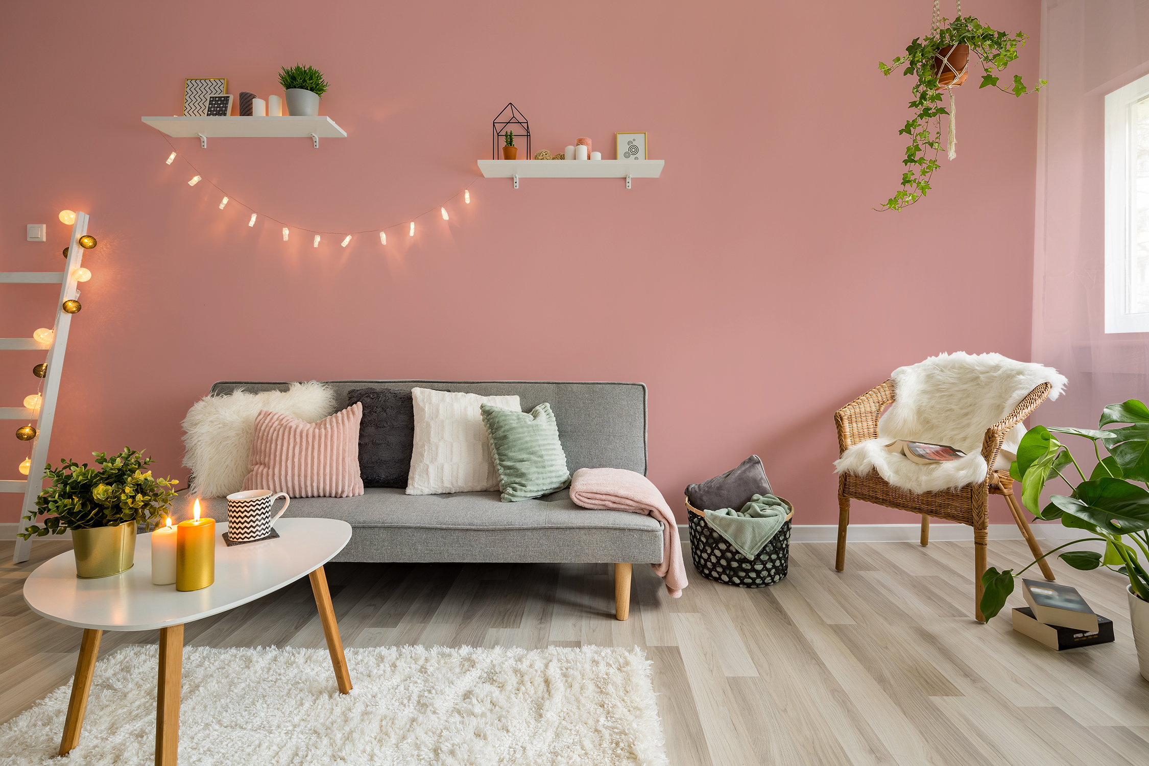 Rosatöne vermitteln im Wohnzimmer eine romanische und gleichzeitig erfrischende Lebendigkeit. Sie schaffen eine sanfte und beruhigende Atmosphäre, die Wärme und Geborgenheit ausstrahlt. Pastellrosa harmoniert wunderbar mit den natürlichen Materialien und hellen Farben des skandinavischen Stils. Rosatöne sind zudem wie geschaffen für den Vintage-Stil. In Kombination mit floralen Mustern, Samtstoffen und golden Akzenten schaffst du eine romantische Stimmung.