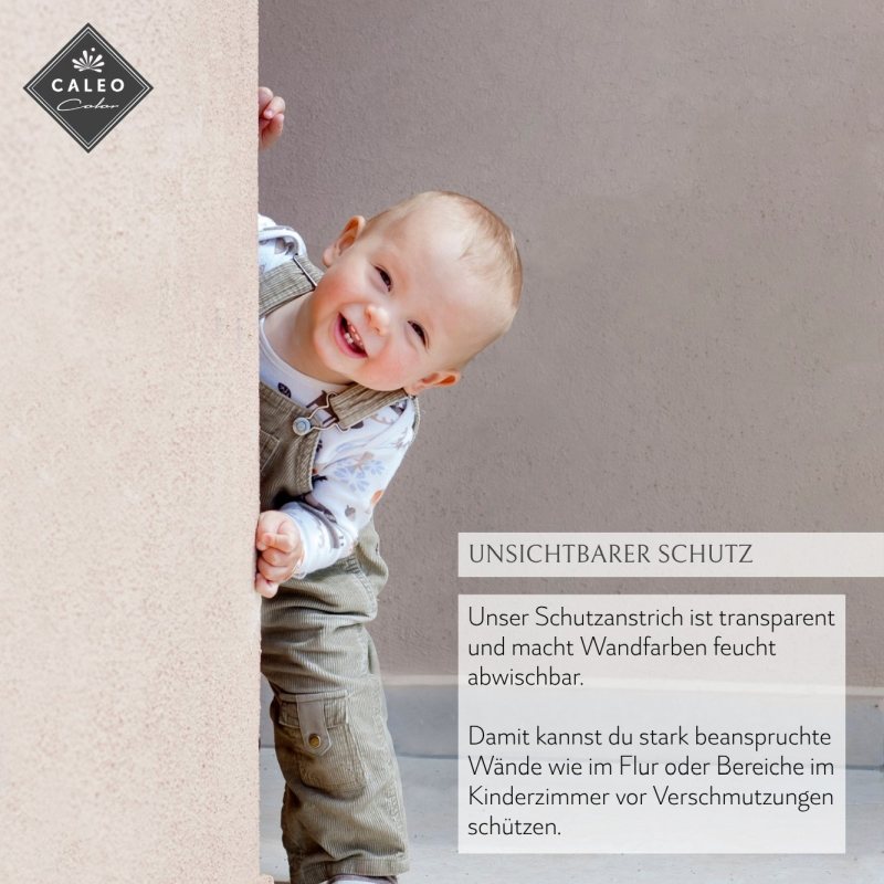 Mit Caleo Color Wandzauber Schutzanstrich kannst du gestrichene Wände in Kinderzimmer vor Verschmutzungen schützen und diese sogar feucht abwischbar machen. Natürlich eignet sich der Schutzanstrich auch für den Flur um Schuhabdrücke zu vermeiden oder in der Küche als Schutz vor Spritzflecken. Trotzdem bleiben die Wände mit Caleo Color Wandzauber Schutzanstrich diffusionsoffen und die raumluftverbessernden Eigenschaften unserer Caleo Color-Lehmfarben bleiben erhalten.